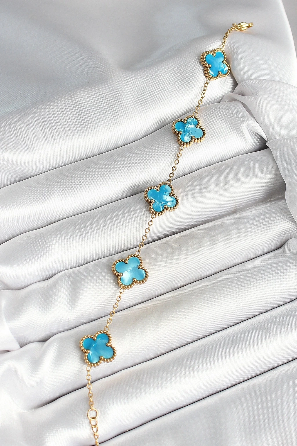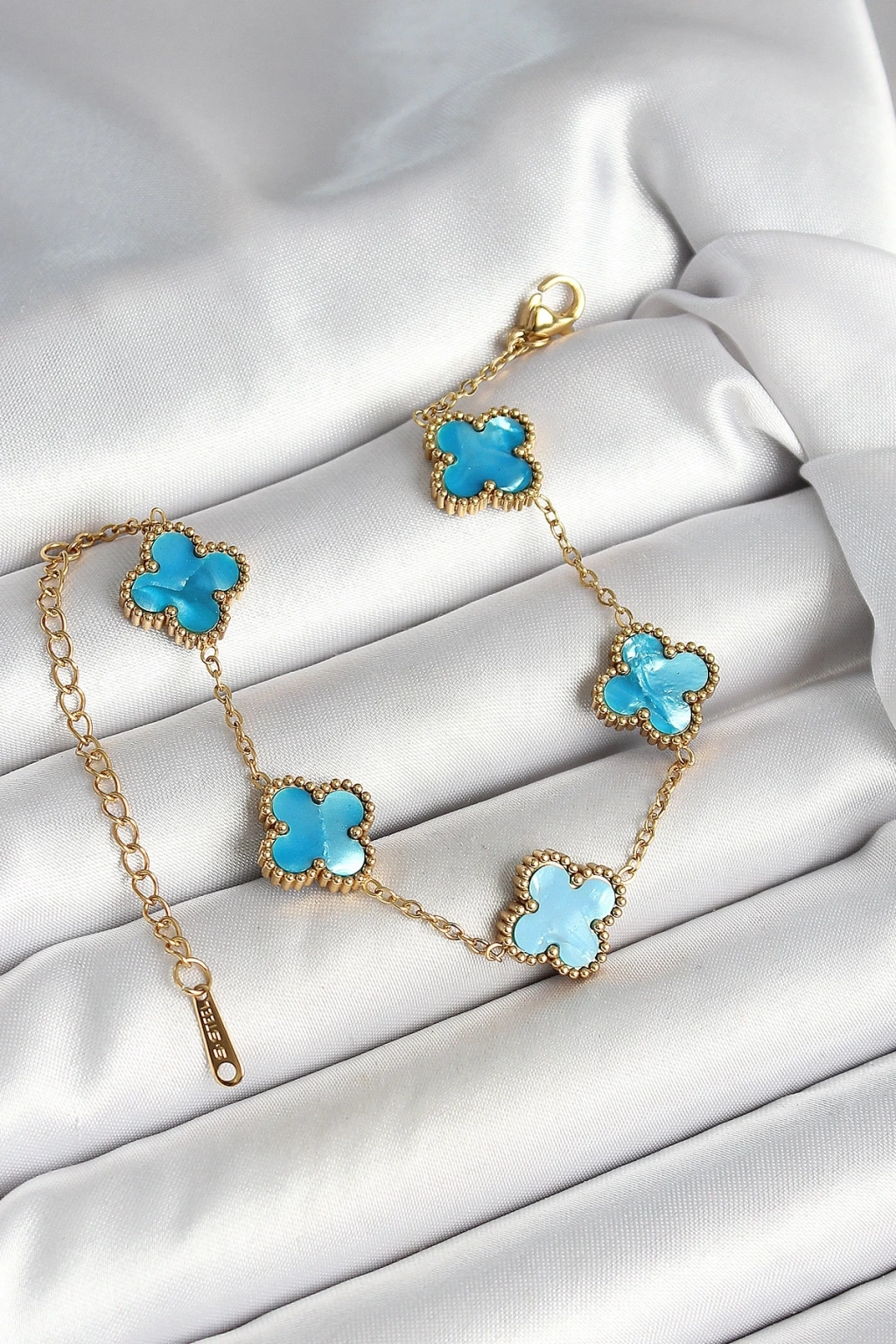 BFS 316L Çelik Sedefli Gökyüzü Mavisi Gold Renk Yonca Kadın Bileklik