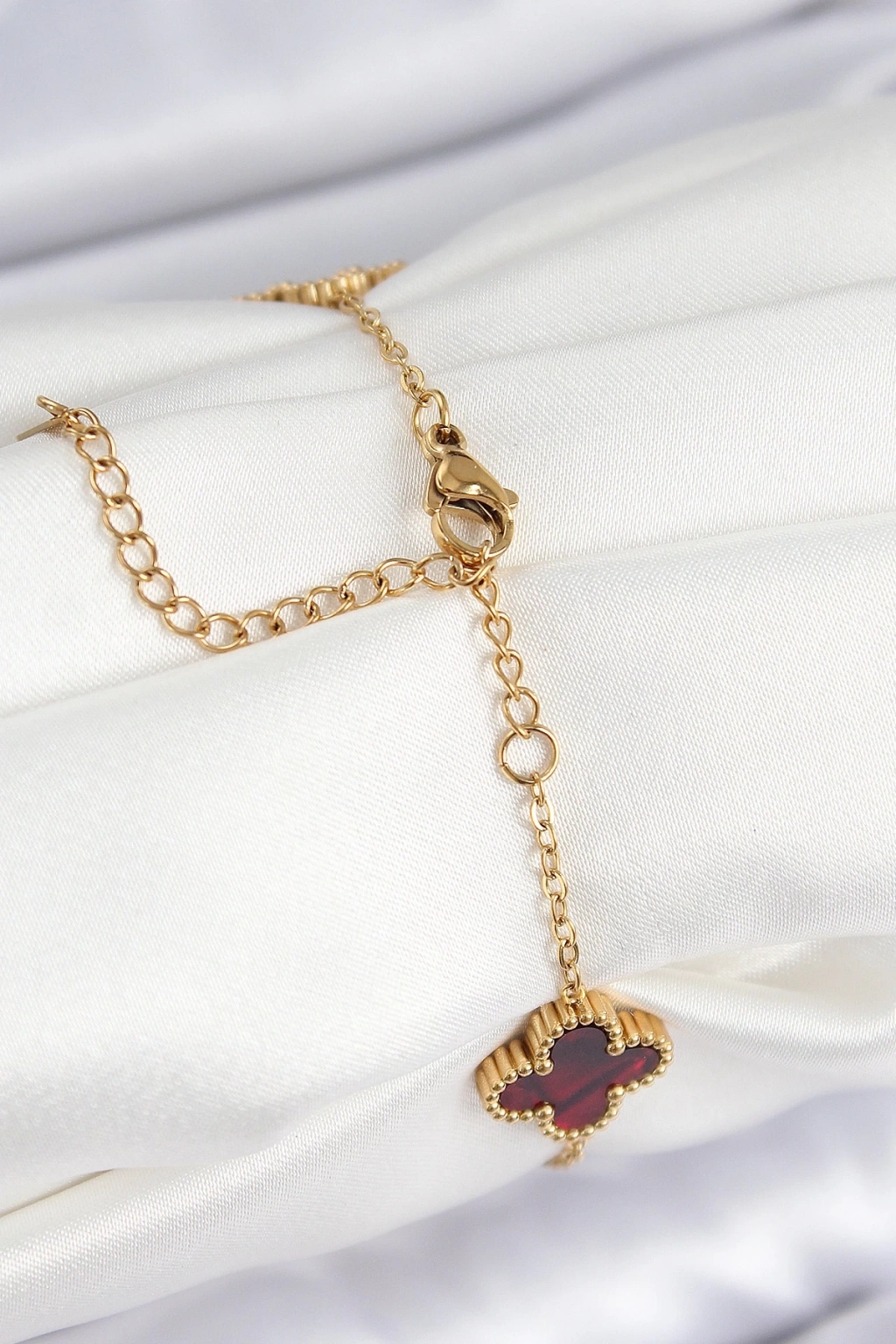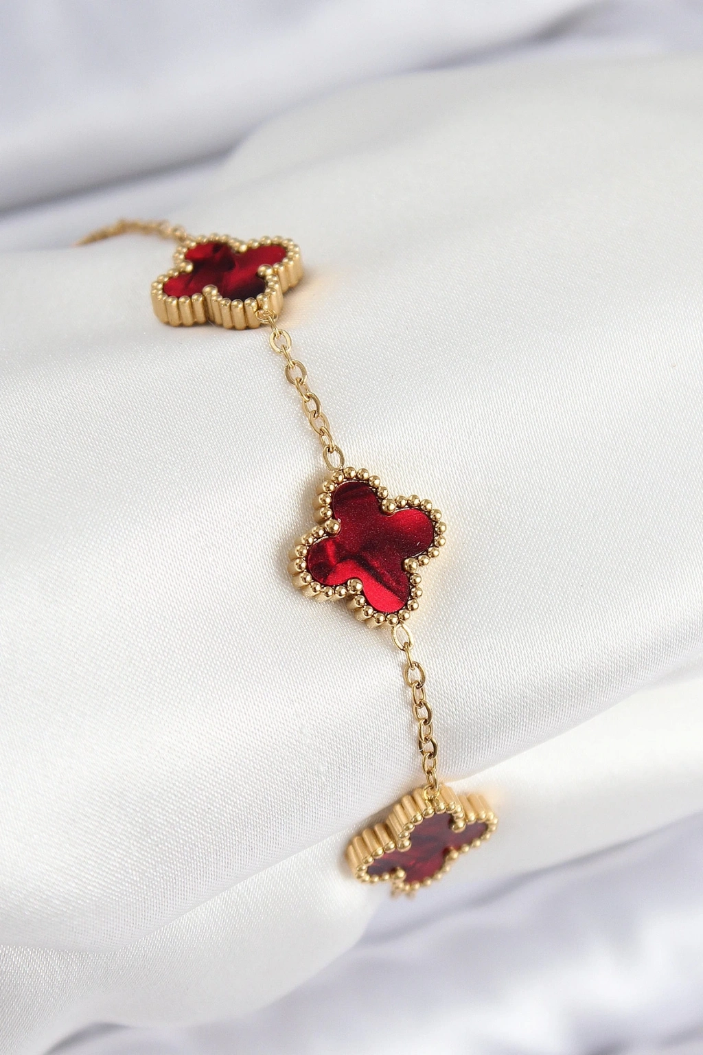 BFS 316L Çelik Sedefli Kırmızı Gümüş Renk Yonca Kadın Bileklik