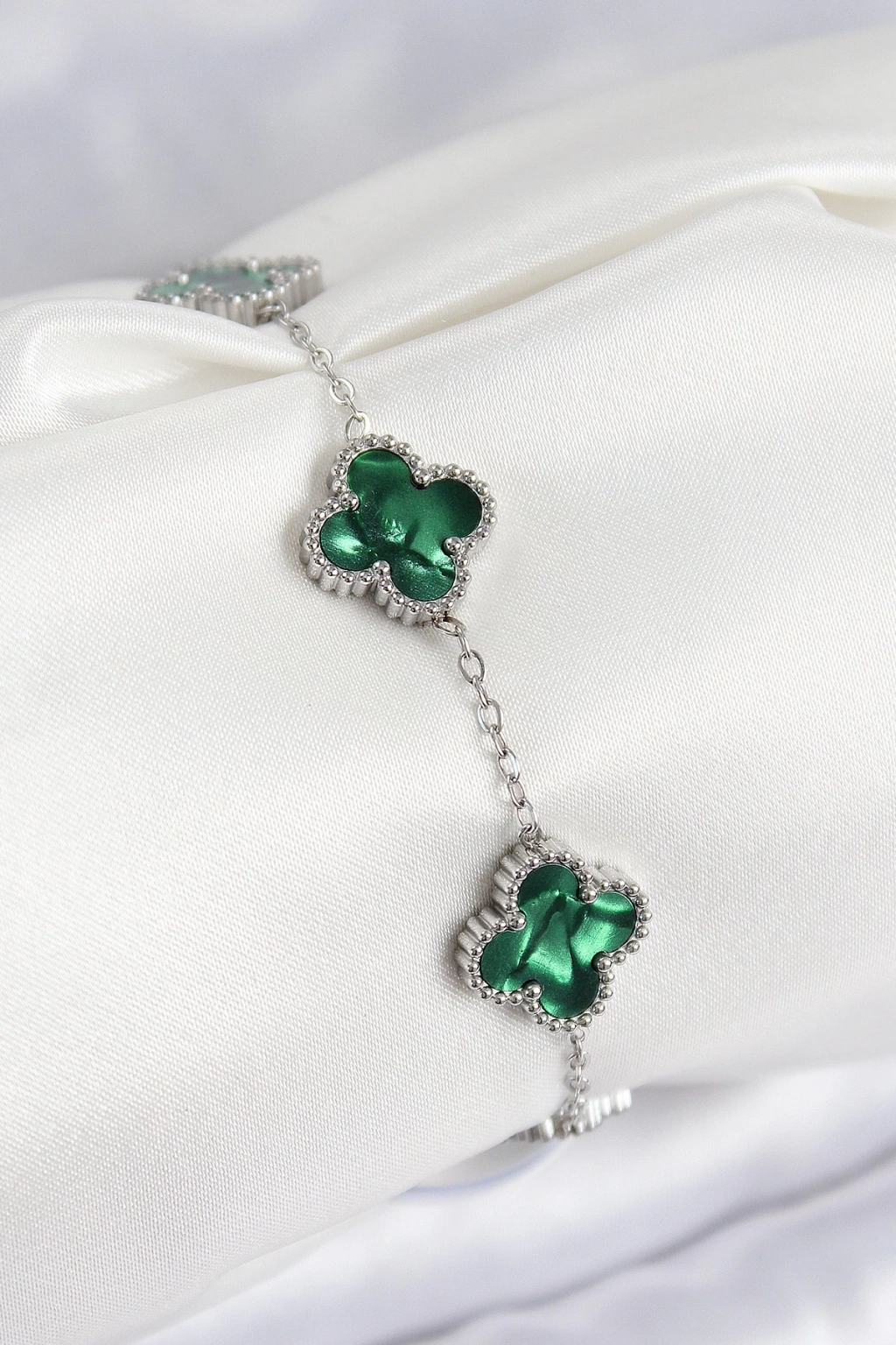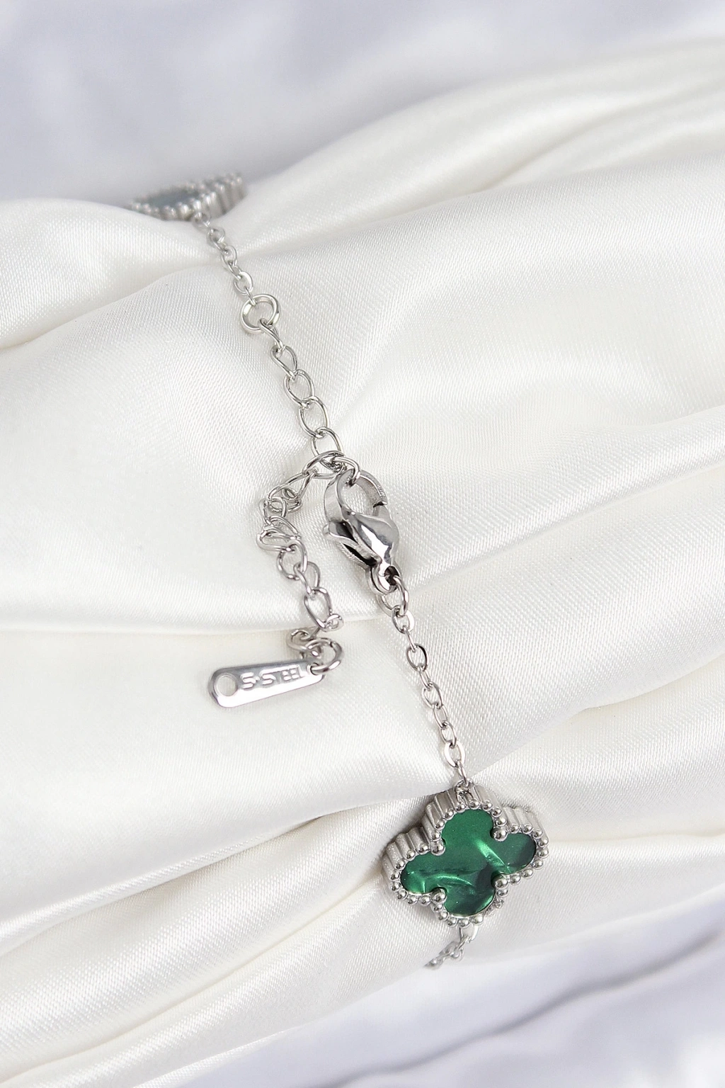 BFS 316L Çelik Sedefli Zümrüt Yeşil Gümüş Renk Yonca Kadın Bileklik
