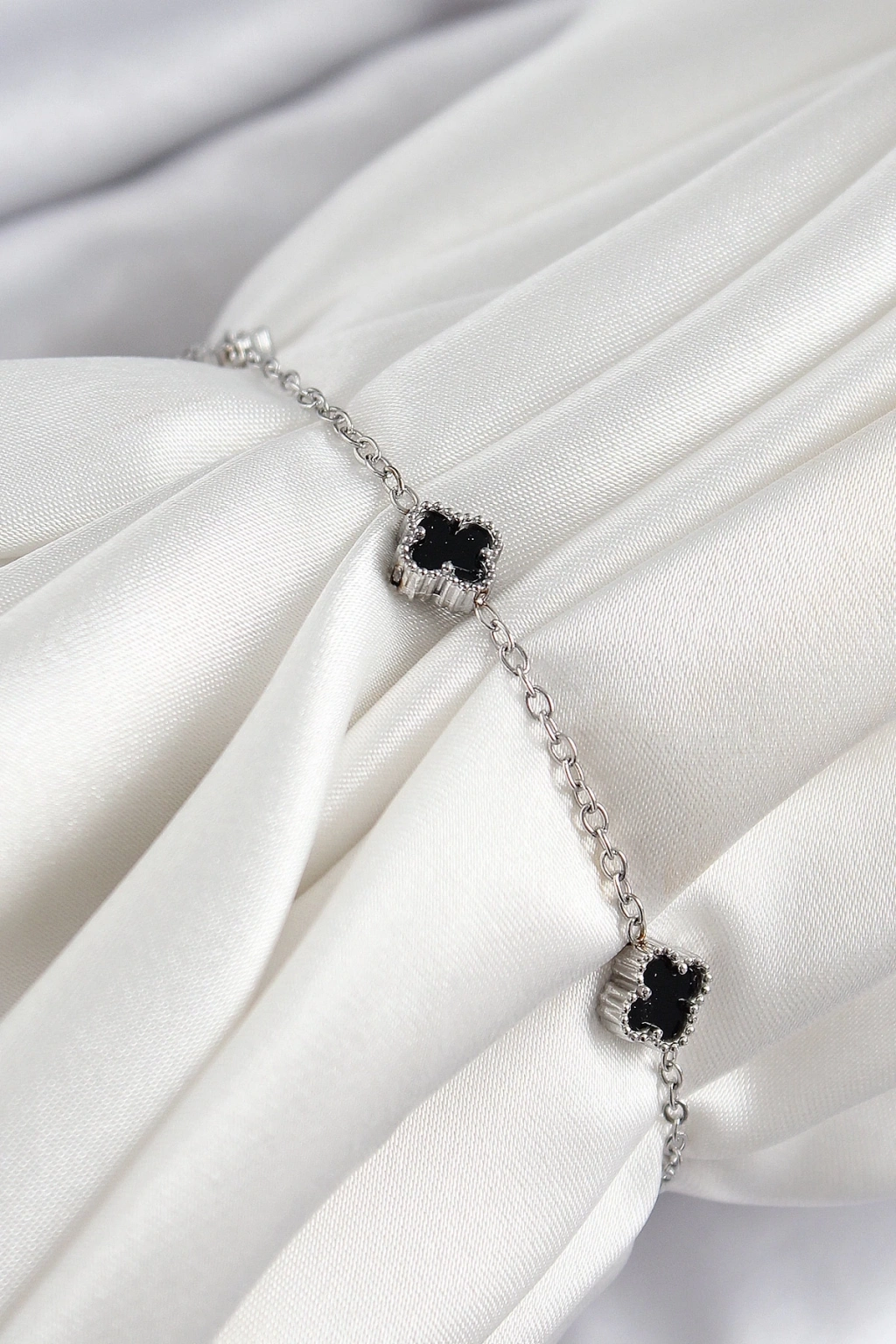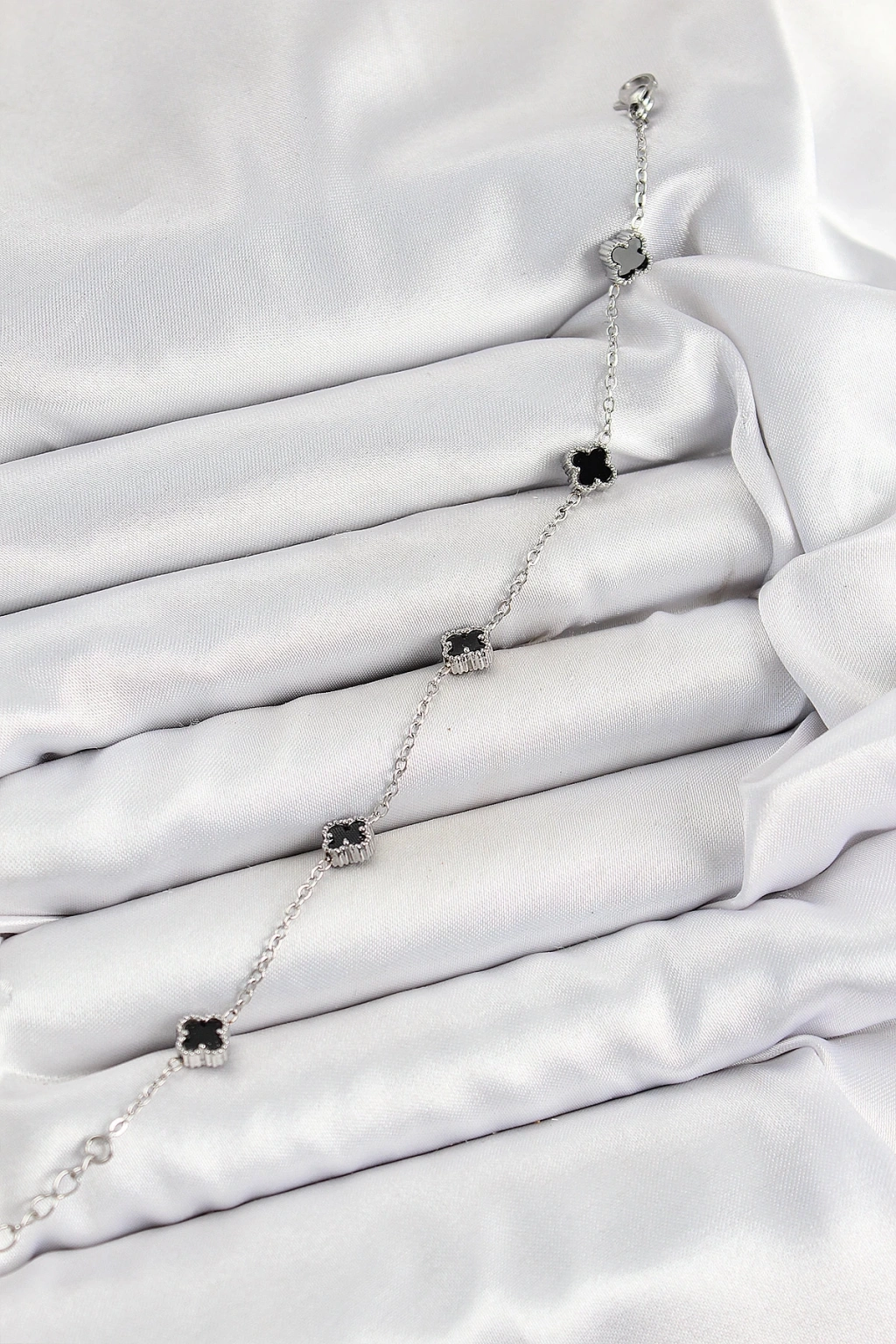 BFS 316L Çelik Siyah Sedef Yonca Model Gümüş Renk Kadın Bileklik