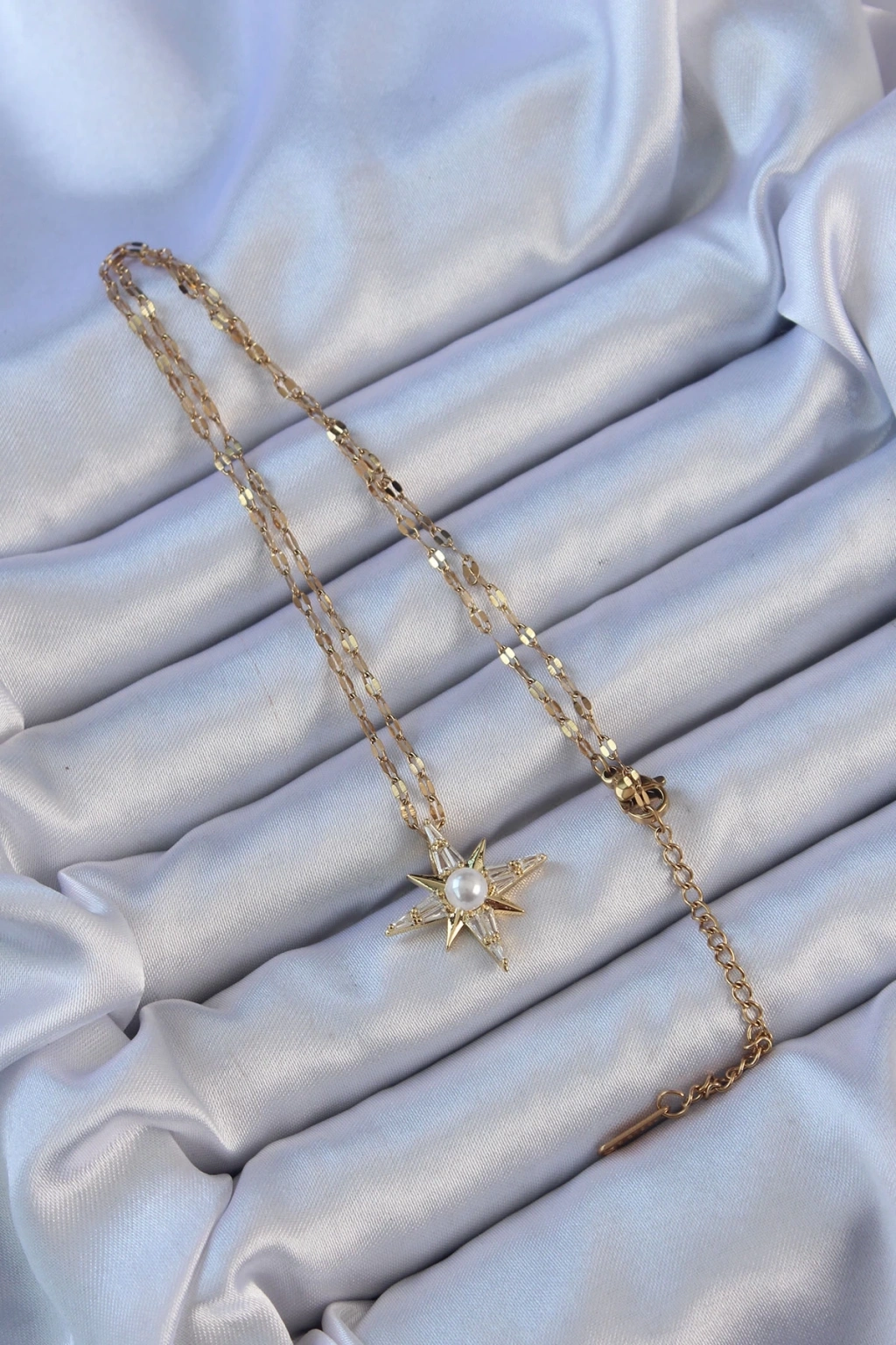 BFS 316L Çelik Zincir Altın Renk Baget Taşlı İnci Detay Kutup Yıldızı Kolye
