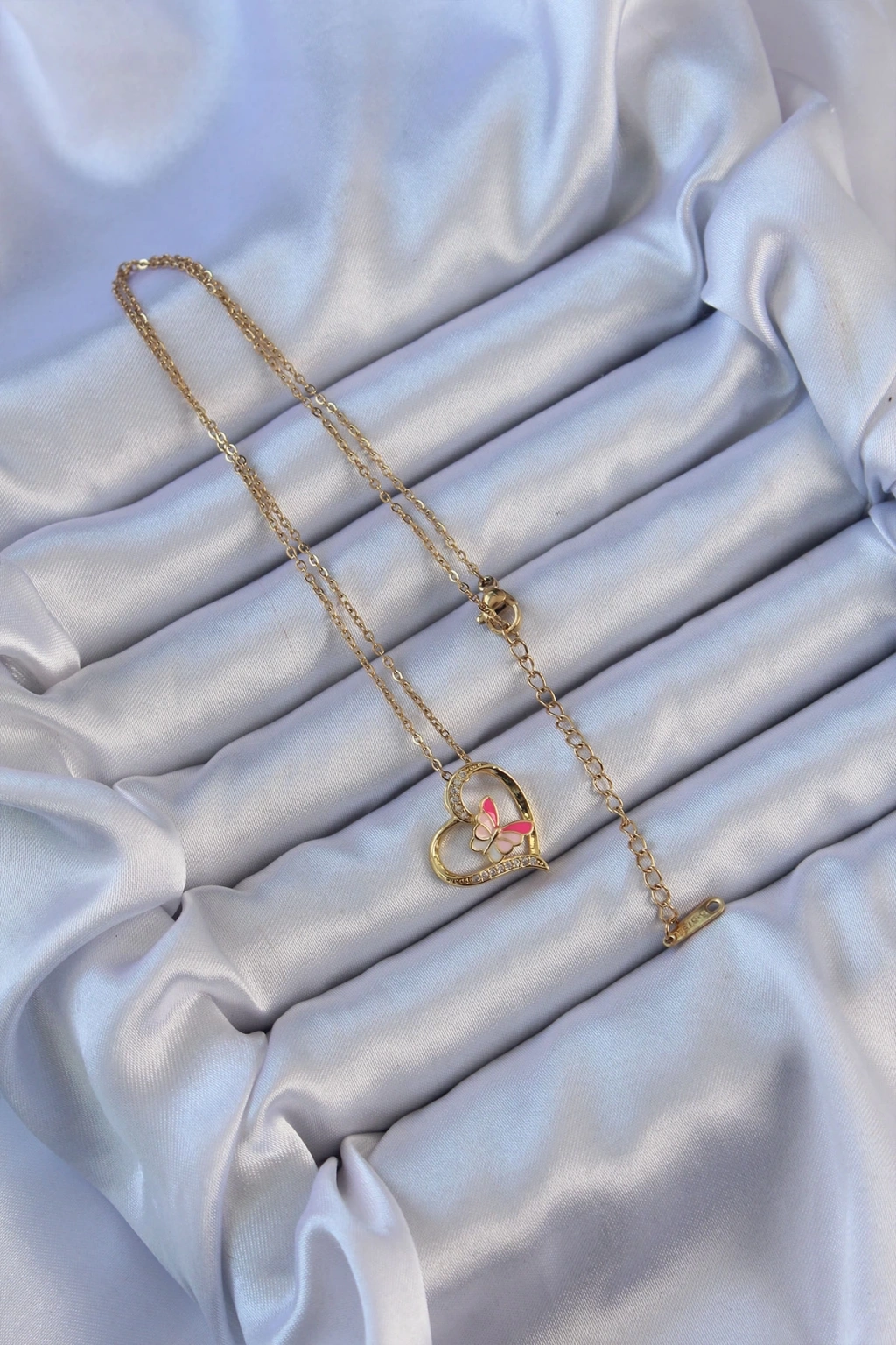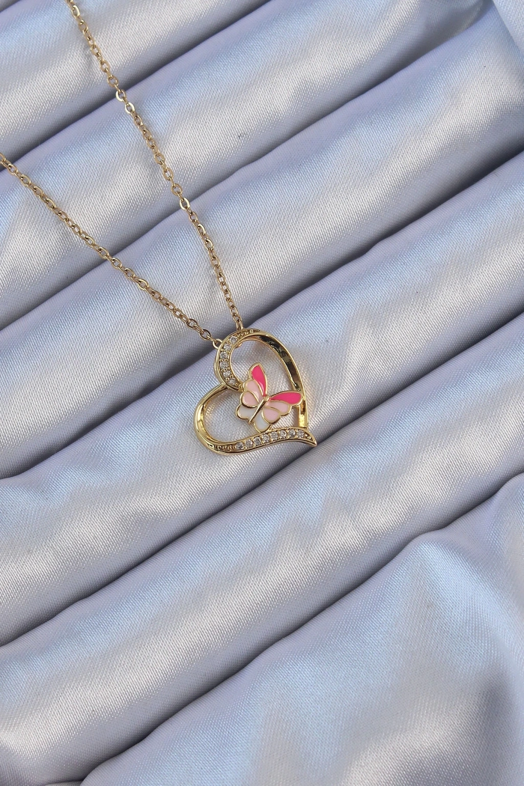 BFS 316L Çelik Zincir Altın Renk Mineli Kelebek Figür Zirkon Taşlı Kalp Kolye