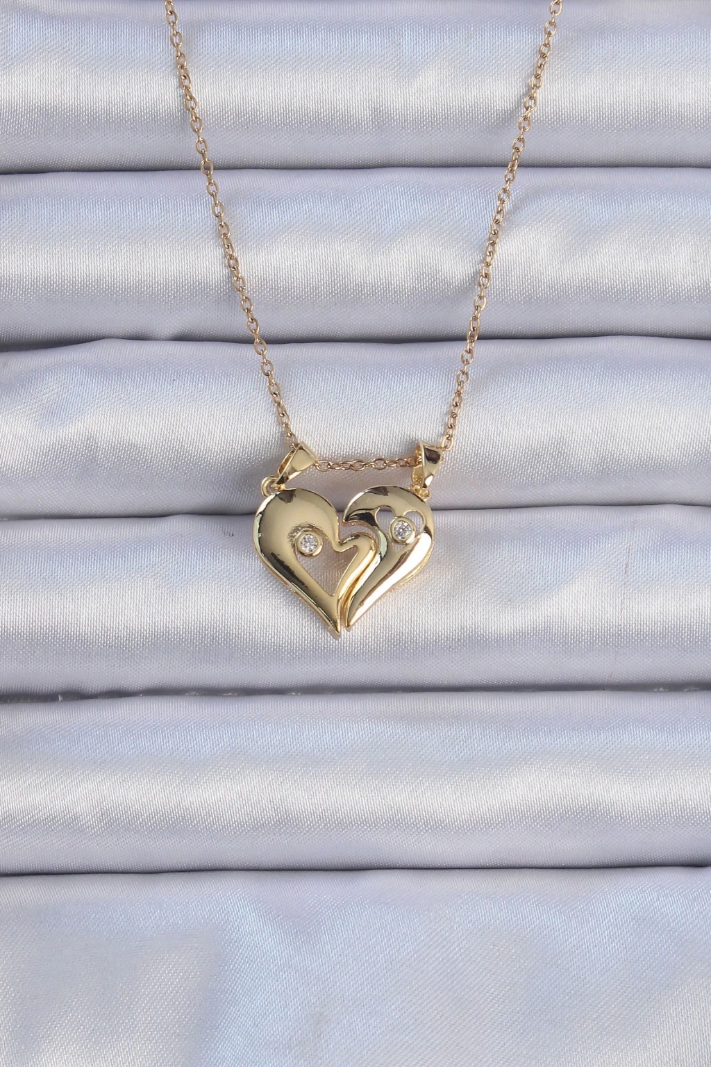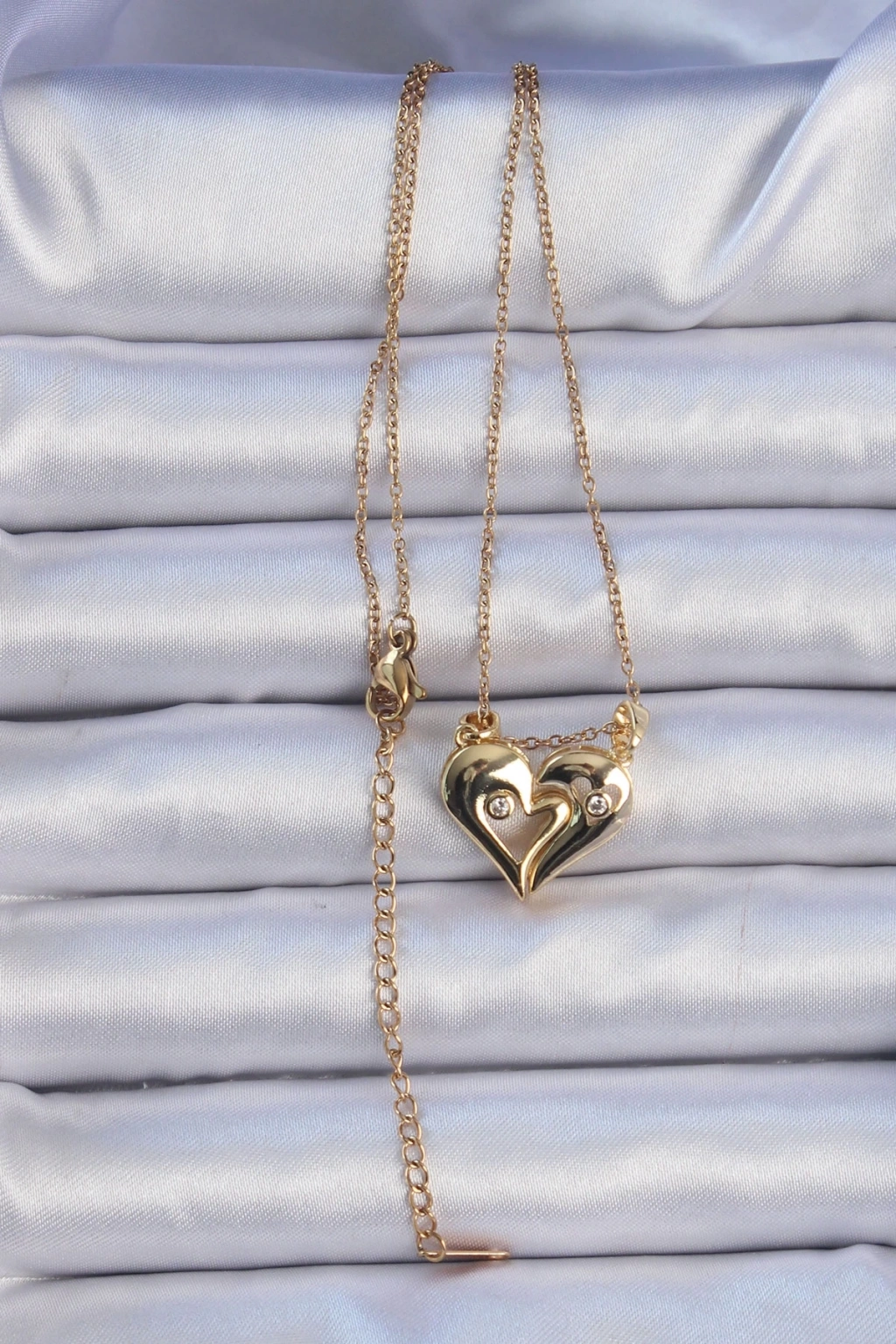 BFS 316L Çelik Zincir Altın Renk Zirkon Taşlı Mıknatıslı Kalp Kolye