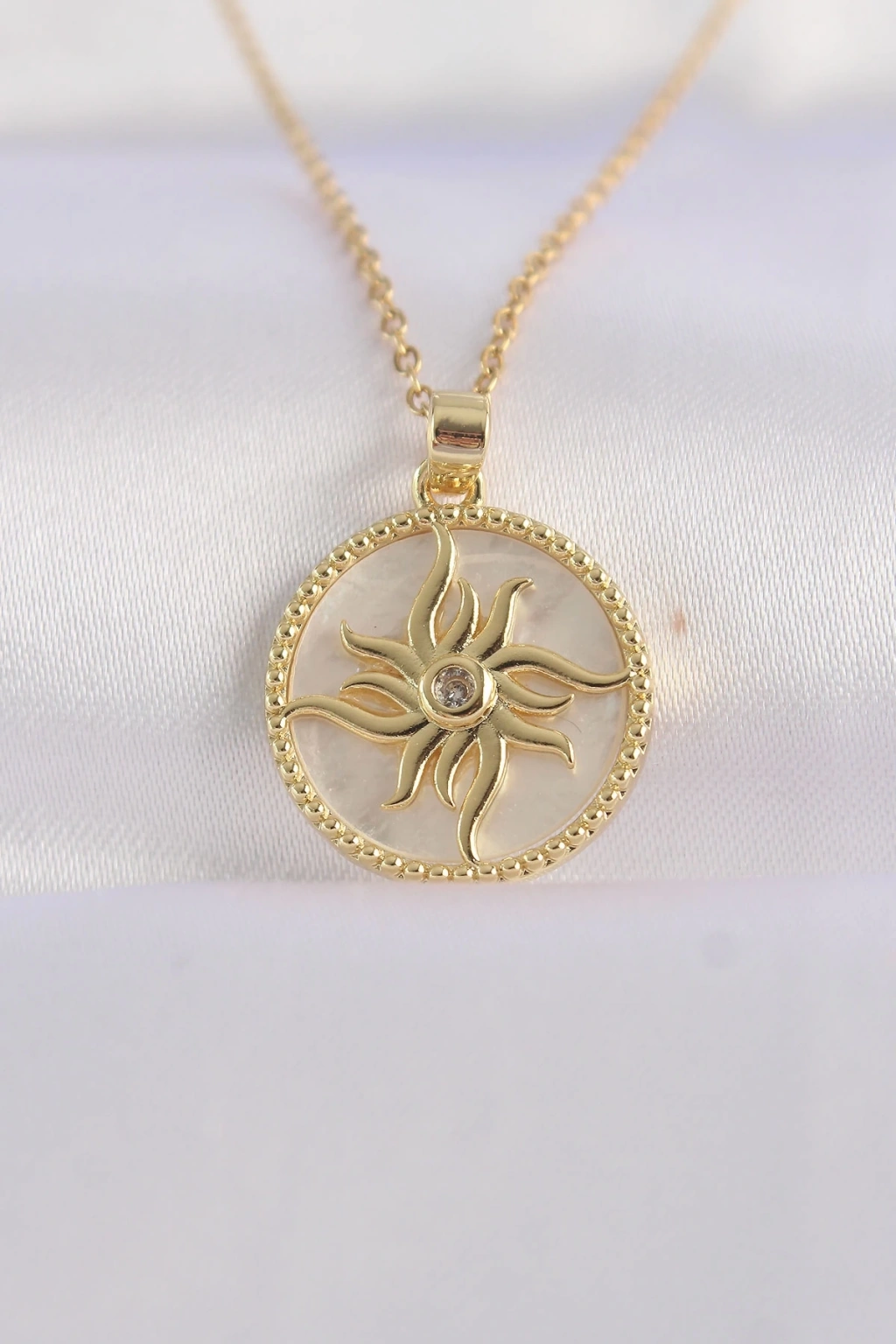 BFS 316L Çelik Zincir Altın Renk Zirkon Taşlı Oval Tasarım Güneş Kolye