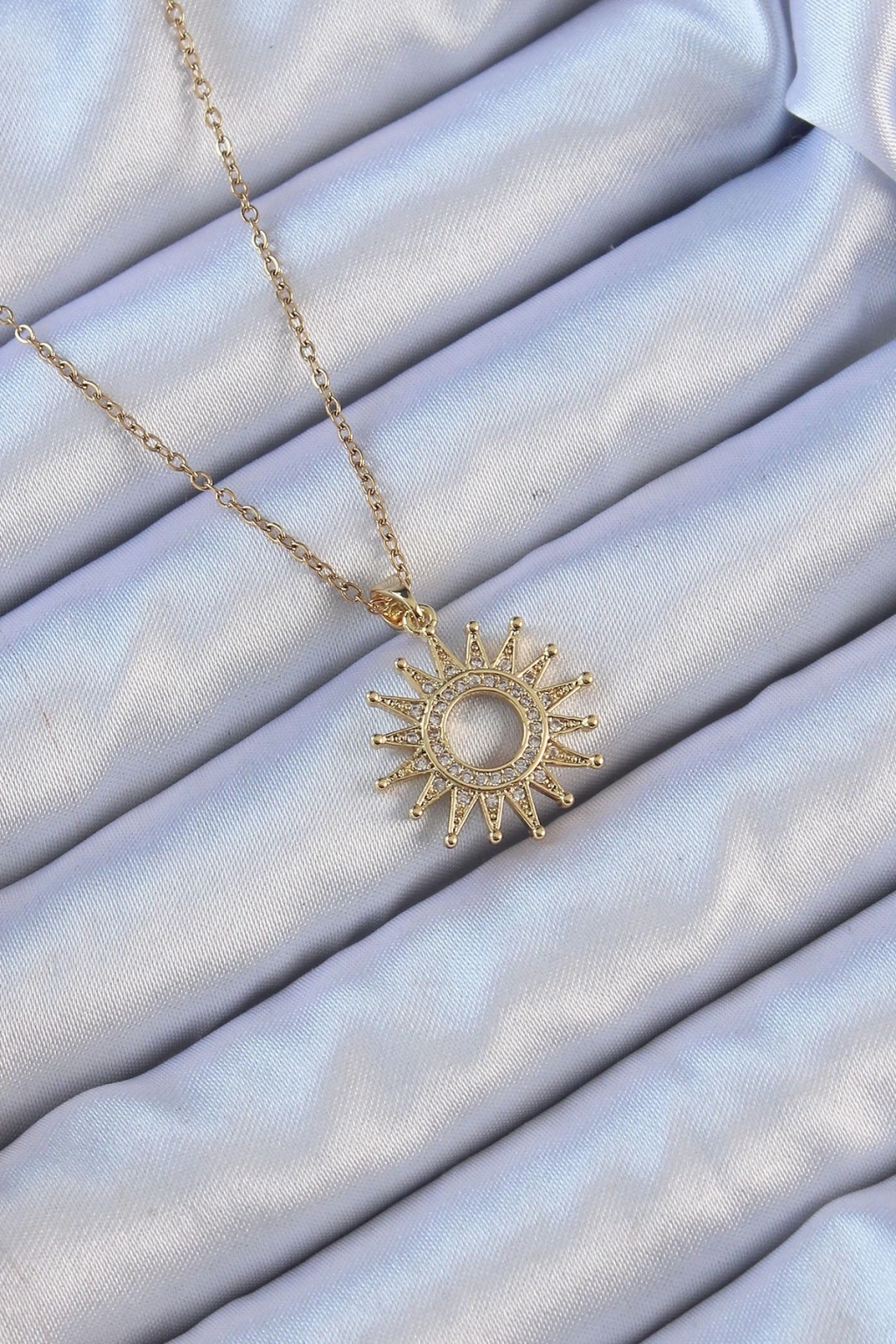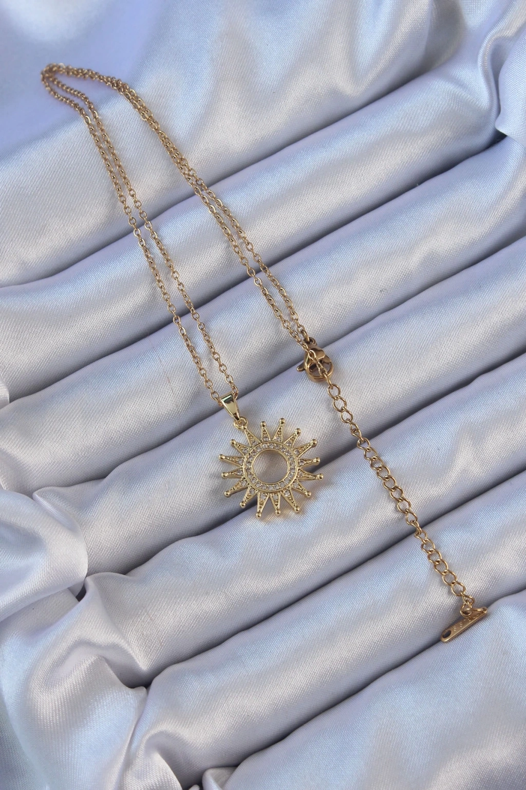 BFS 316L Çelik Zincir Altın Renk Zirkon Taşlı Parlayan Güneş Kolye