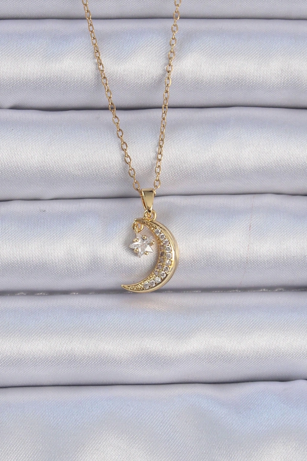 BFS 316L Çelik Zincir Altın Renk Zirkon Taşlı Sallantılı Ay Yıldız Kolye