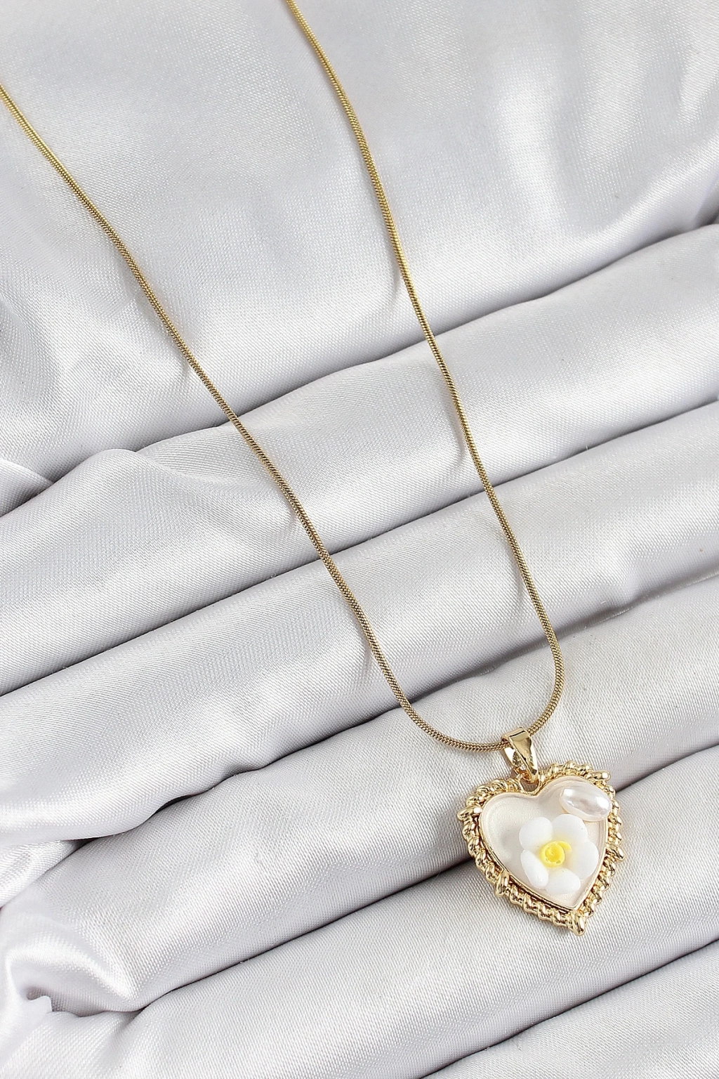 BFS 316L Çelik Zincir Beyaz Sanatsal Portre İnci Detaylı Papatya Figürlü Kalp Model Gold Renk Kadın Kolye