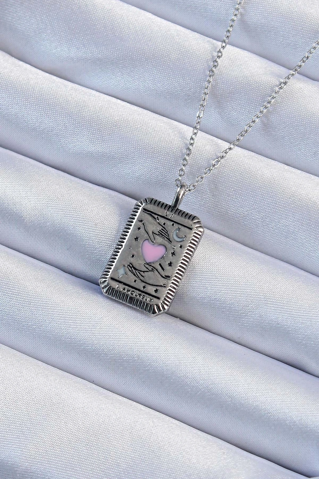 BFS 316L Çelik Zincir Eskitme Gümüş Renk Pembe Mineli Kalp Figürlü Tarot Kolye