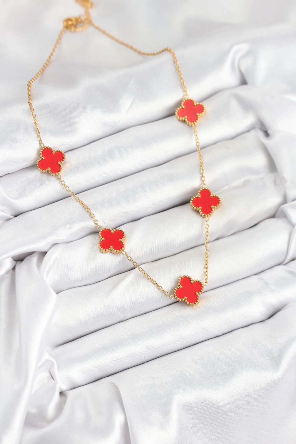 BFS 316L Çelik Zincir Gold Kırmızı Renk Yonca Kadın Kolye