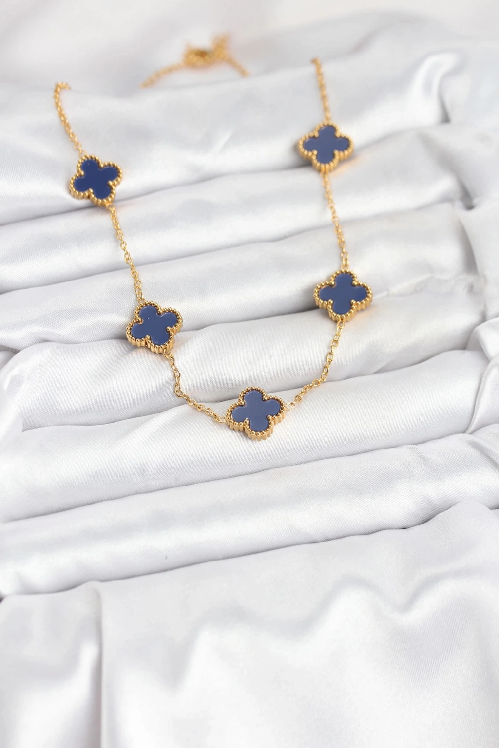 BFS 316L Çelik Zincir Gold Renk Lacivert Yonca Kadın Kolye
