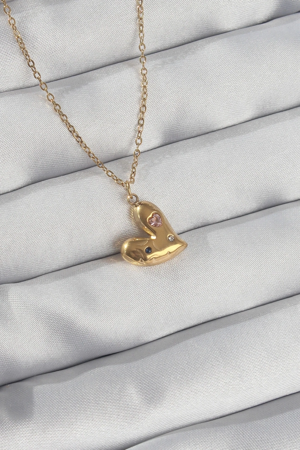 BFS 316L Çelik Zincir Gold Renk Renkli Zirkon Taşlı Kalp Kolye