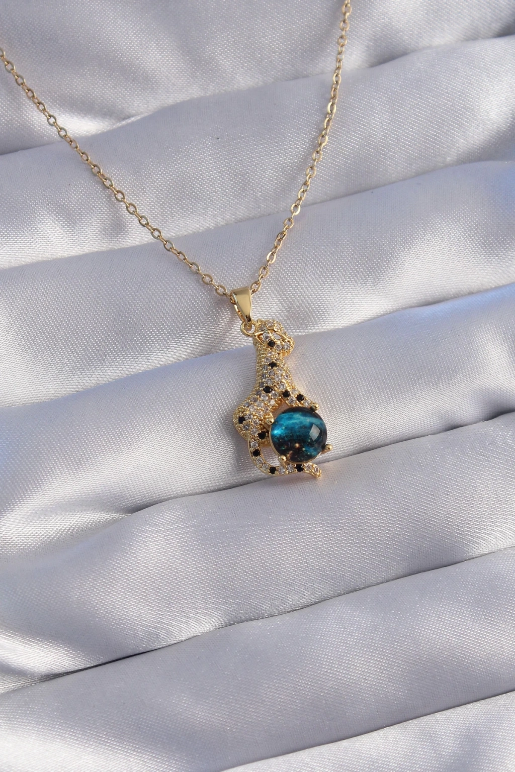 BFS 316L Çelik Zincir Gold Renk Zirkon Taşlı Panter Figürlü Gezegen Kolye
