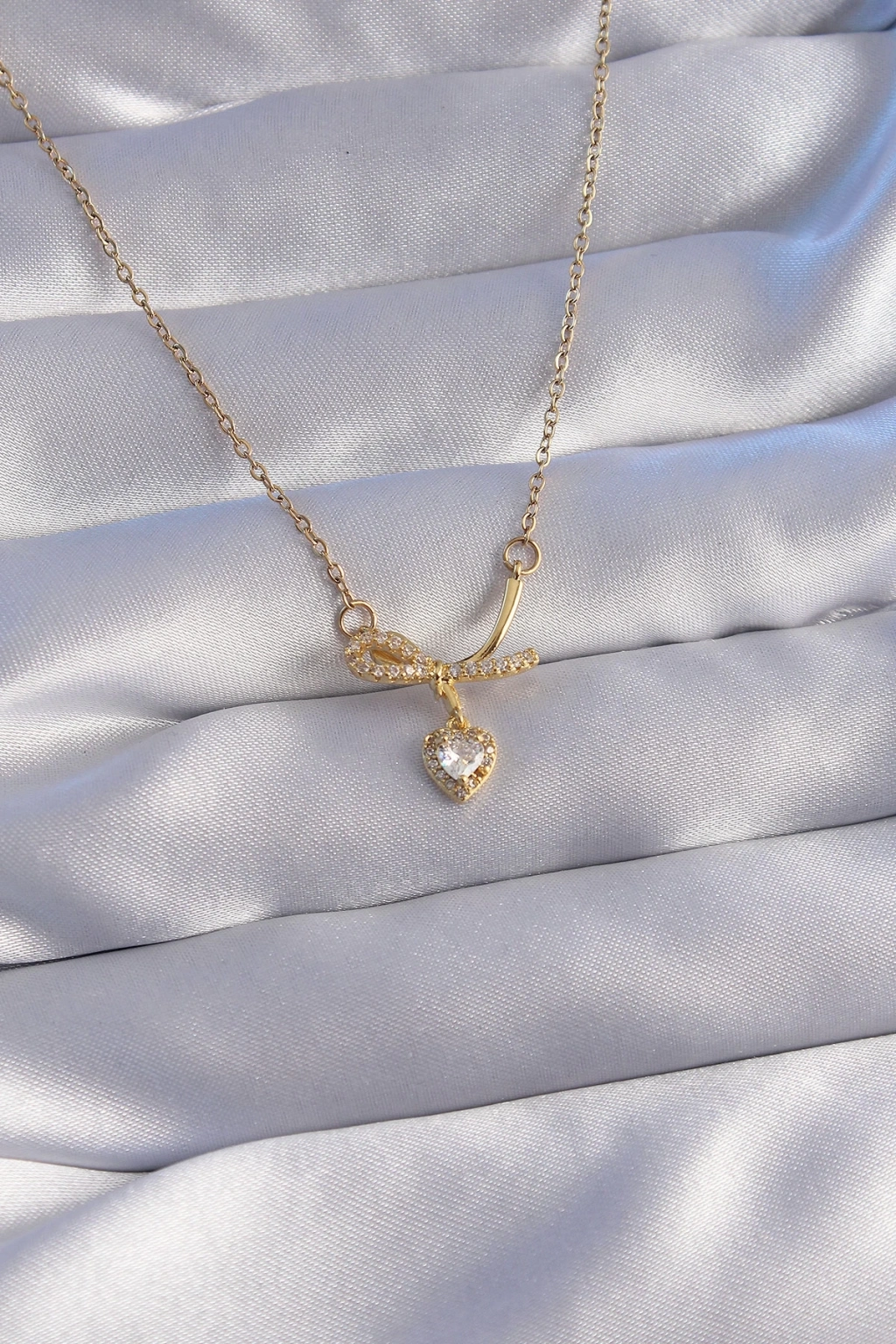 BFS 316L Çelik Zincir Gold Renk Zirkon Taşlı Yarım Fiyonk Kalp Kolye