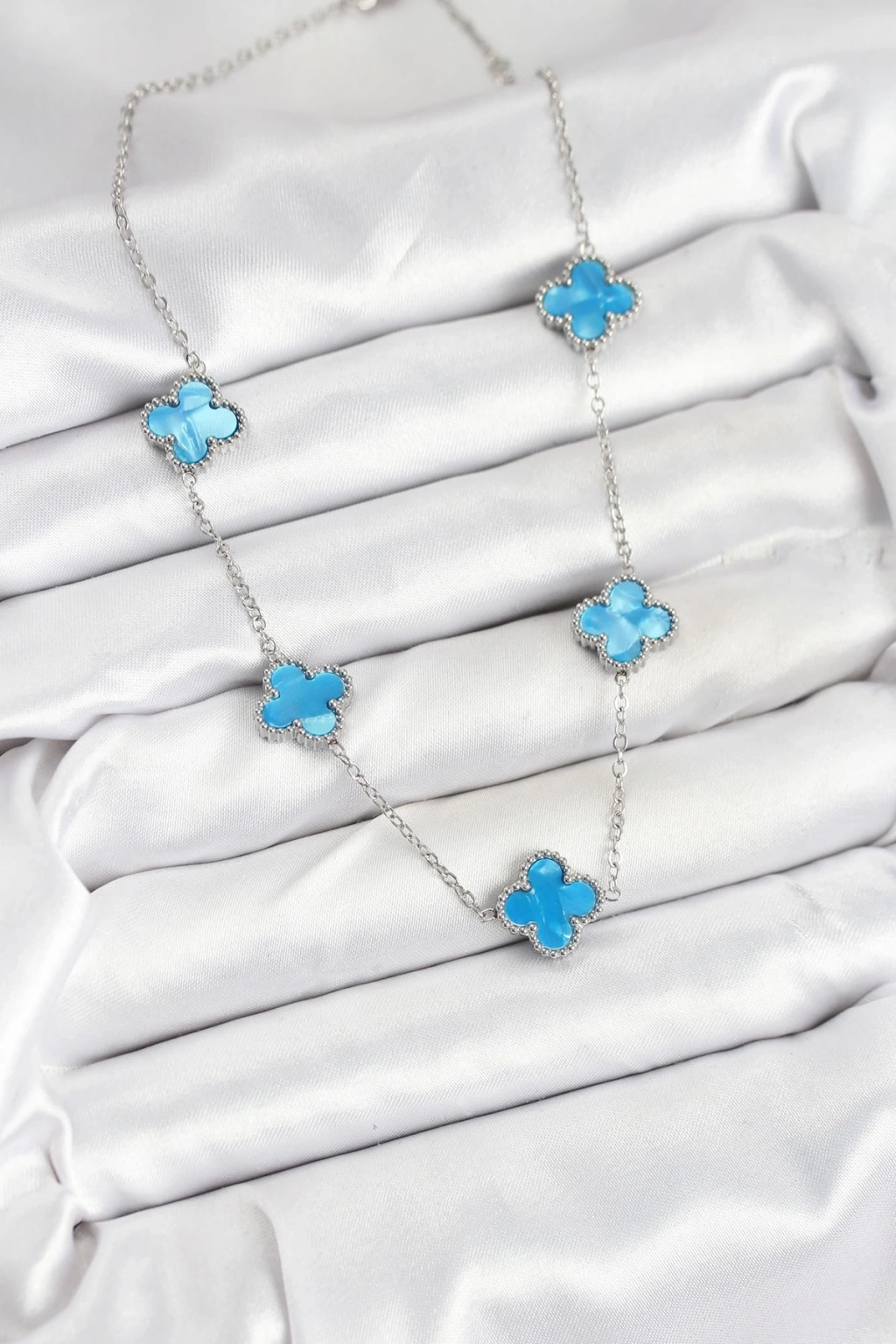 BFS 316L Çelik Zincir Gümüş Buz Mavisi Renk Yonca Kadın Kolye