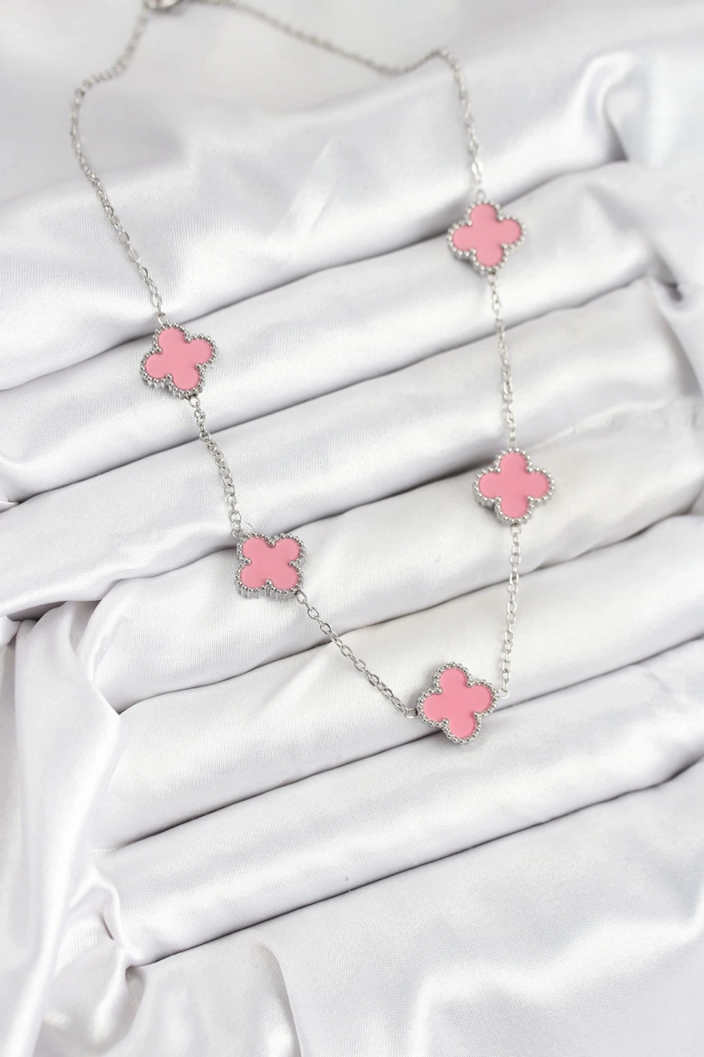 BFS 316L Çelik Zincir Gümüş Pembe Renk Yonca Kadın Kolye