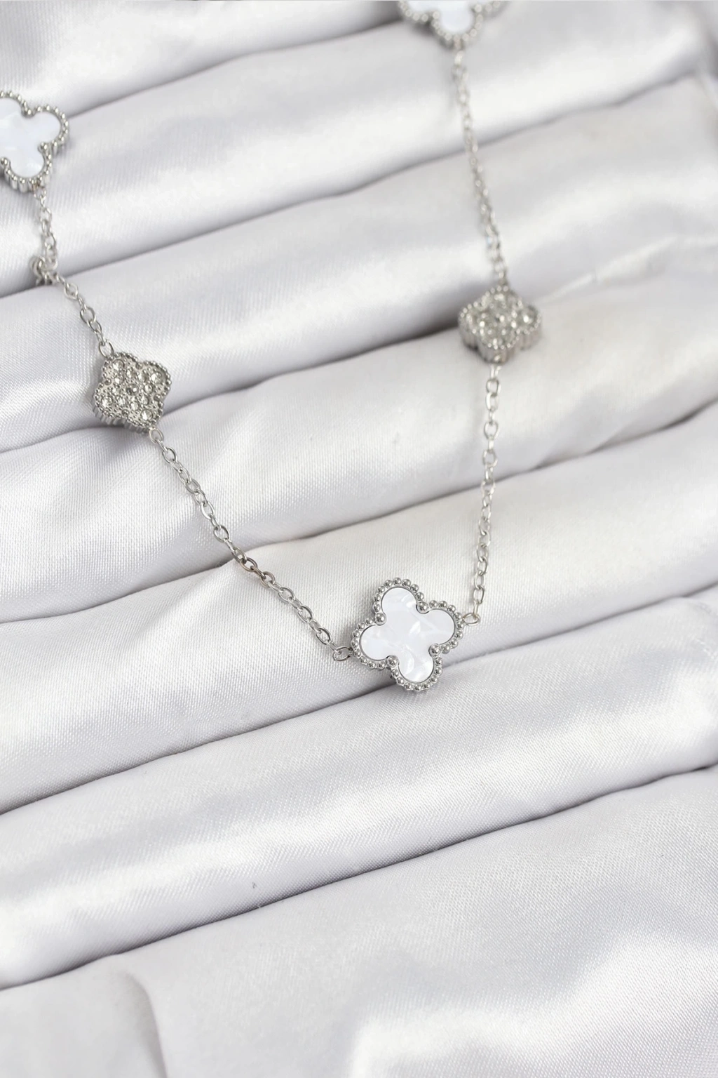 BFS 316L Çelik Zincir Gümüş Renk Beyaz ve Zirkon Taşlı Yonca Kadın Kolye