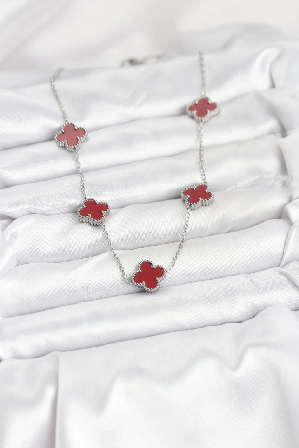 BFS 316L Çelik Zincir Gümüş Renk Bordo Renk Yonca Kadın Kolye