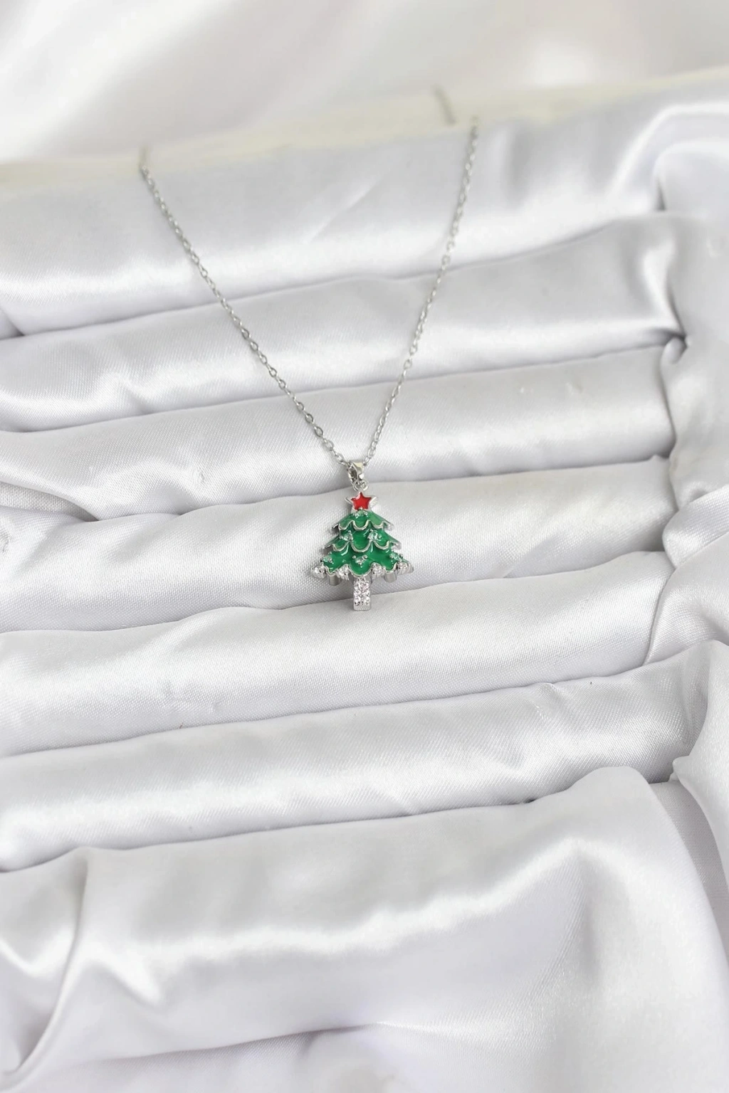 BFS 316L Çelik Zincir Gümüş Renk Çam Ağacı Model Yılbaşı Temalı Kadın Kolye