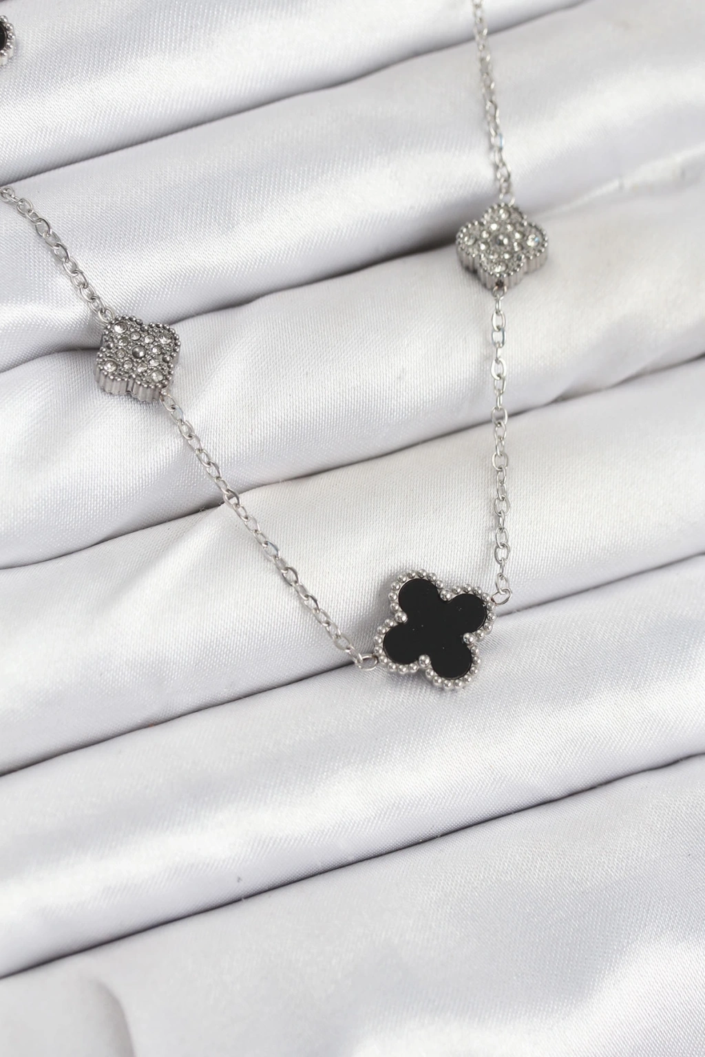 BFS 316L Çelik Zincir Gümüş Renk Siyah ve Zirkon Taşlı Yonca Kadın Kolye