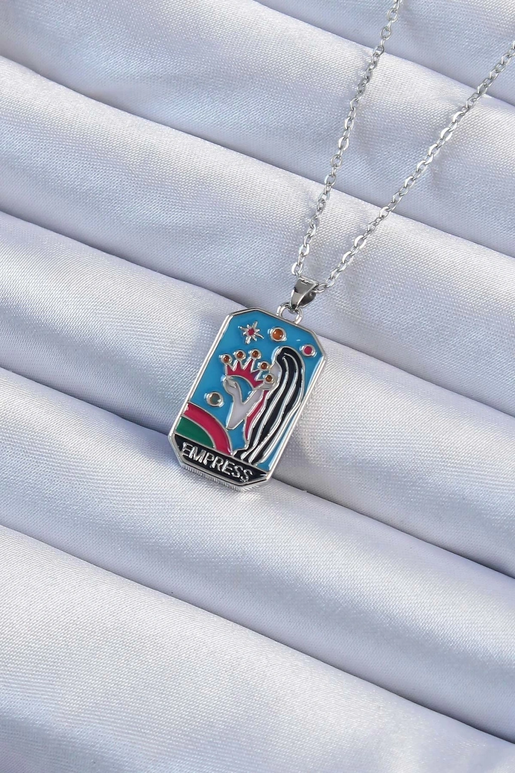 BFS 316L Çelik Zincir Gümüş Renk Taç ve Kız Figürlü Renkli Mineli Tarot Kolye
