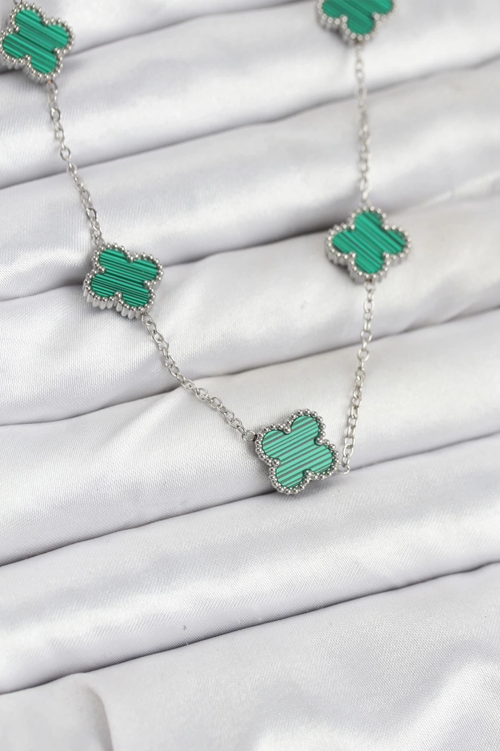 BFS 316L Çelik Zincir Gümüş Renk Yeşil Yonca Kadın Kolye