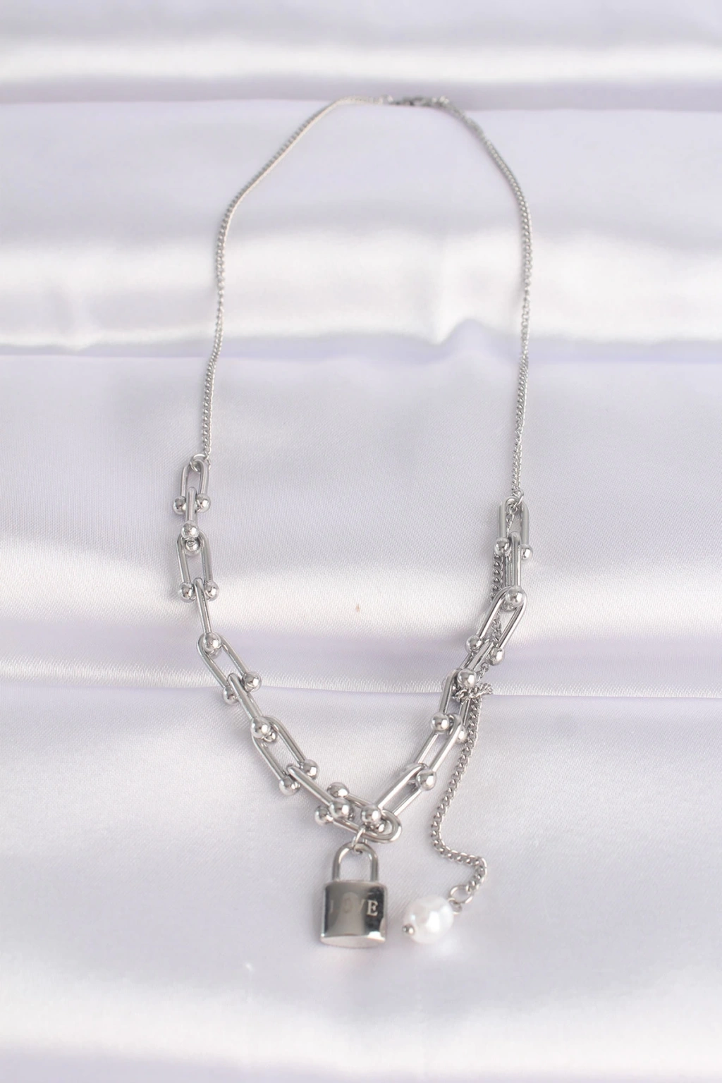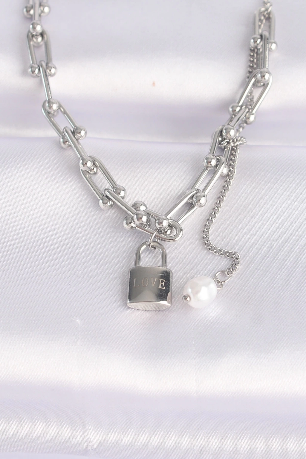 BFS 316L Çelik Zincir Gümüş Renk Zincirli Love Yazılı Kilit Kolye