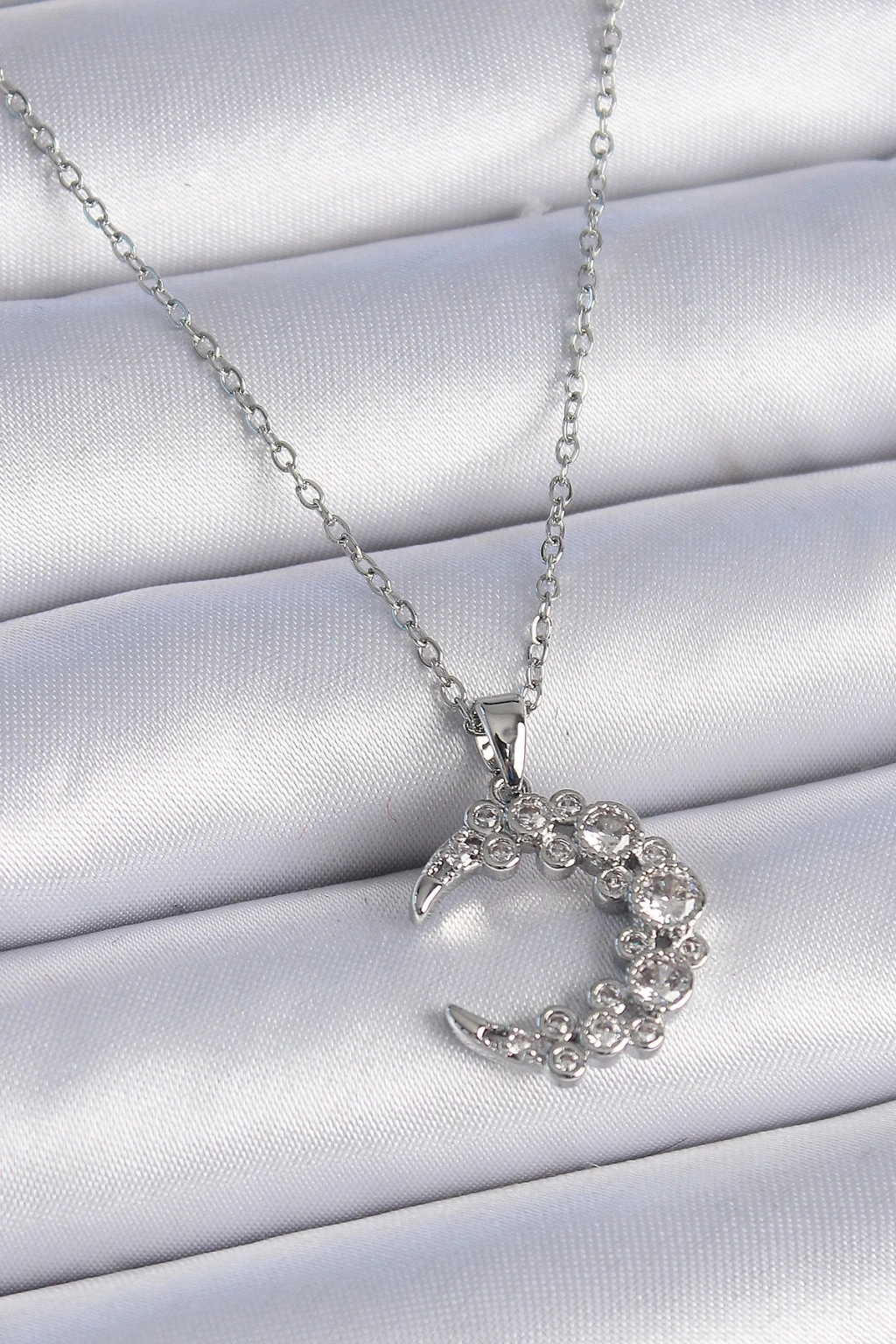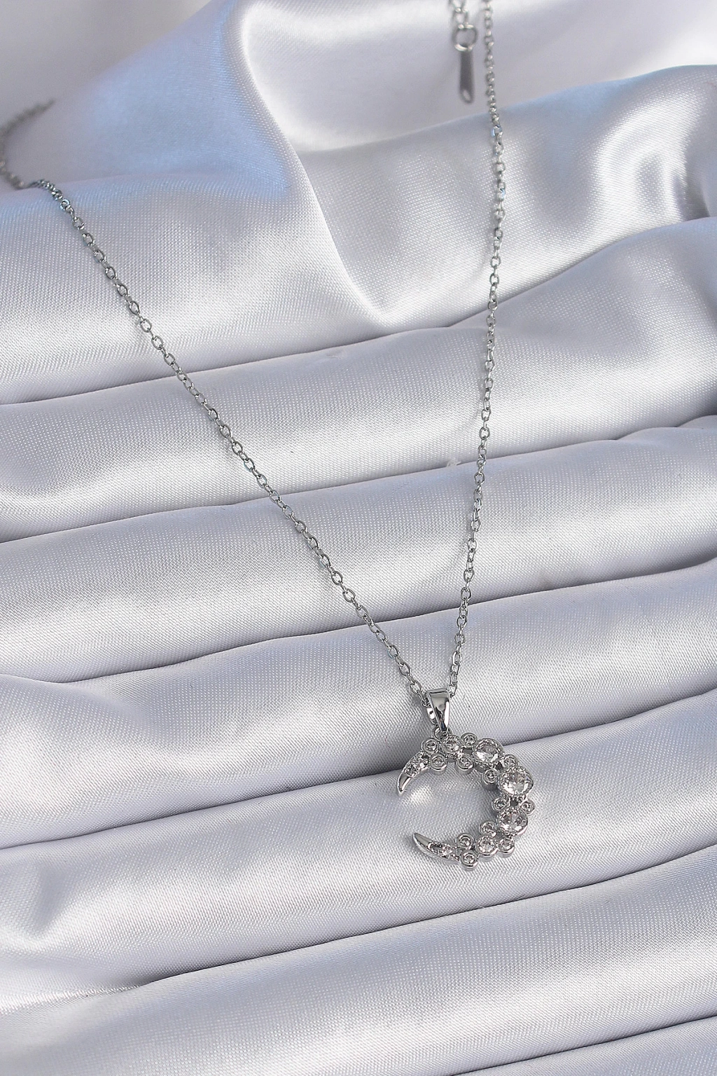 BFS 316L Çelik Zincir Gümüş Renk Zirkon Taşlı Hilal Model Kadın Kolye
