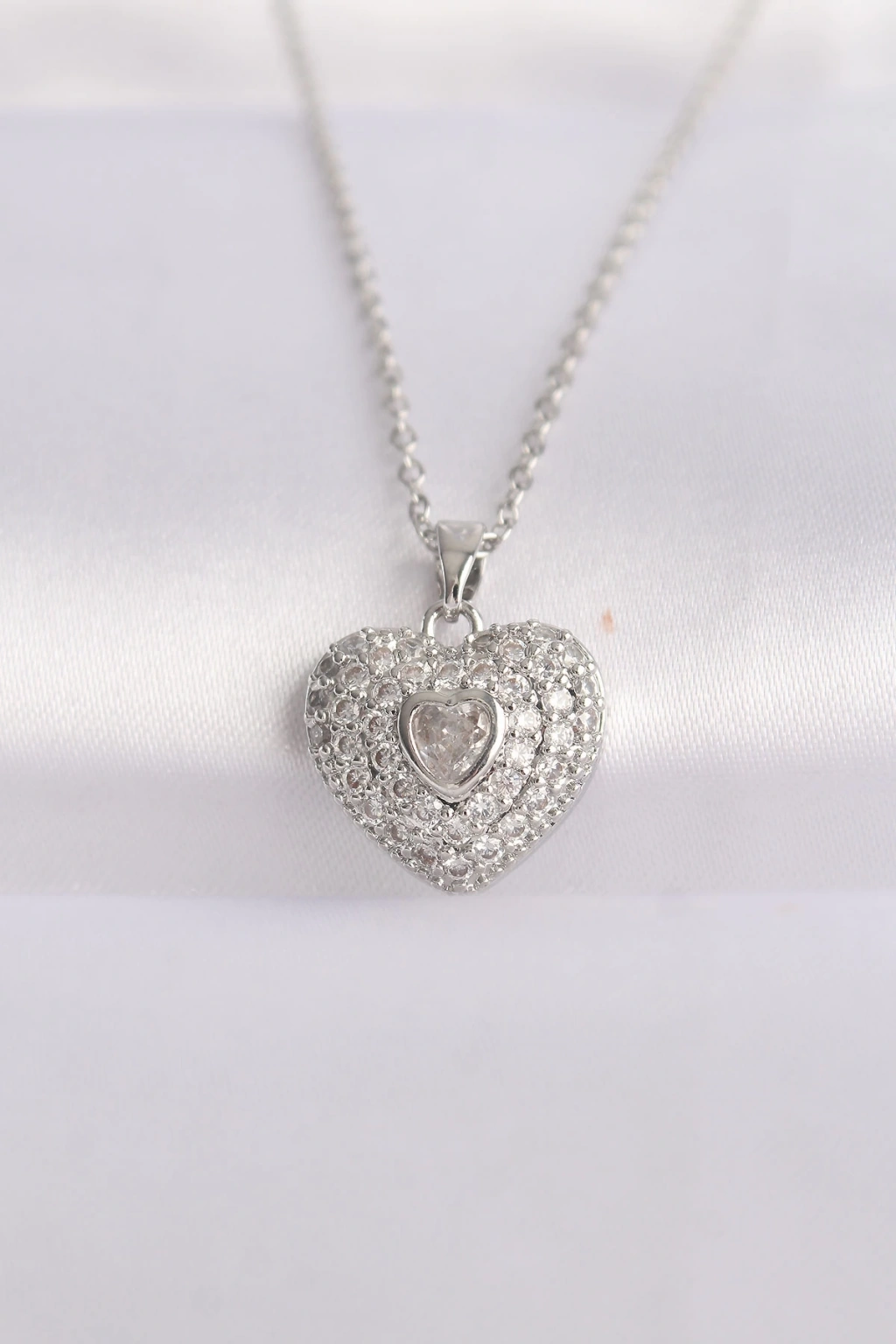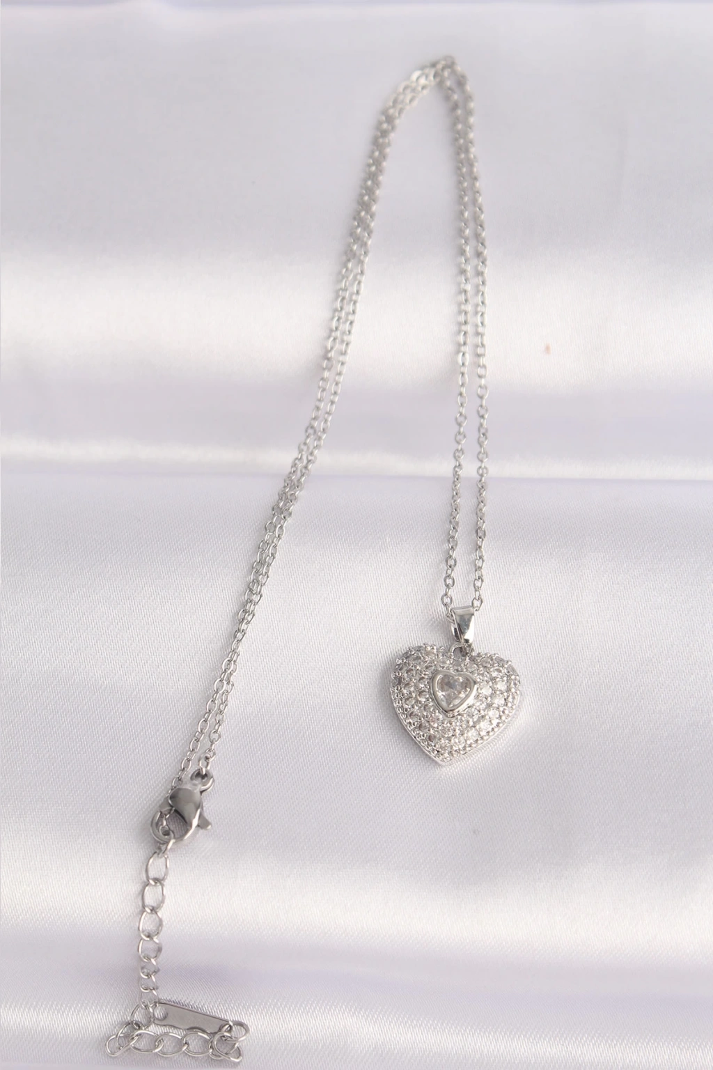 BFS 316L Çelik Zincir Gümüş Renk Zirkon Taşlı Kalp Kolye
