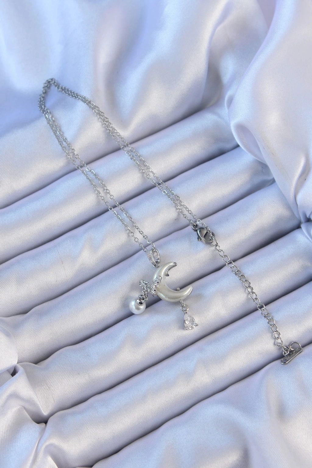 BFS 316L Çelik Zincir Gümüş Renk Zirkon Taşlı Kelebekli Mineli Ay Kolye
