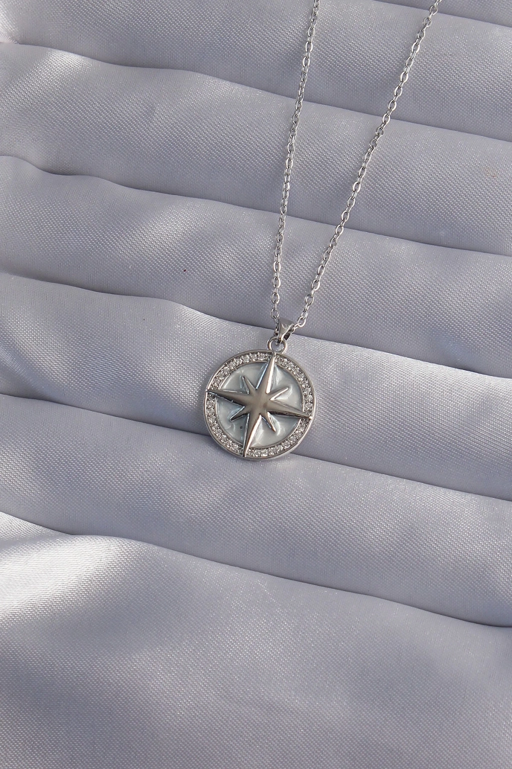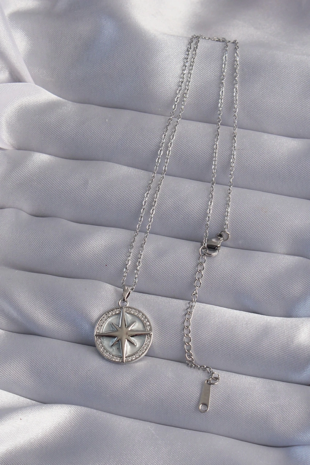 BFS 316L Çelik Zincir Gümüş Renk Zirkon Taşlı Kutup Yıldızı Kolye