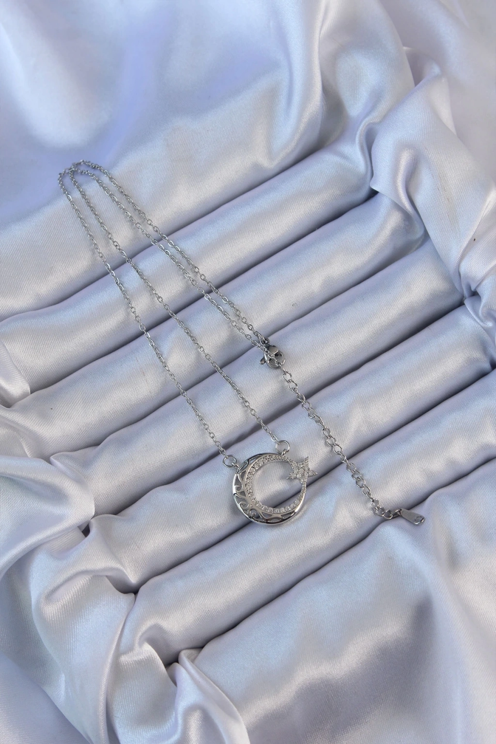 BFS 316L Çelik Zincir Gümüş Renk Zirkon Taşlı Motifli Ay Yıldız Kolye