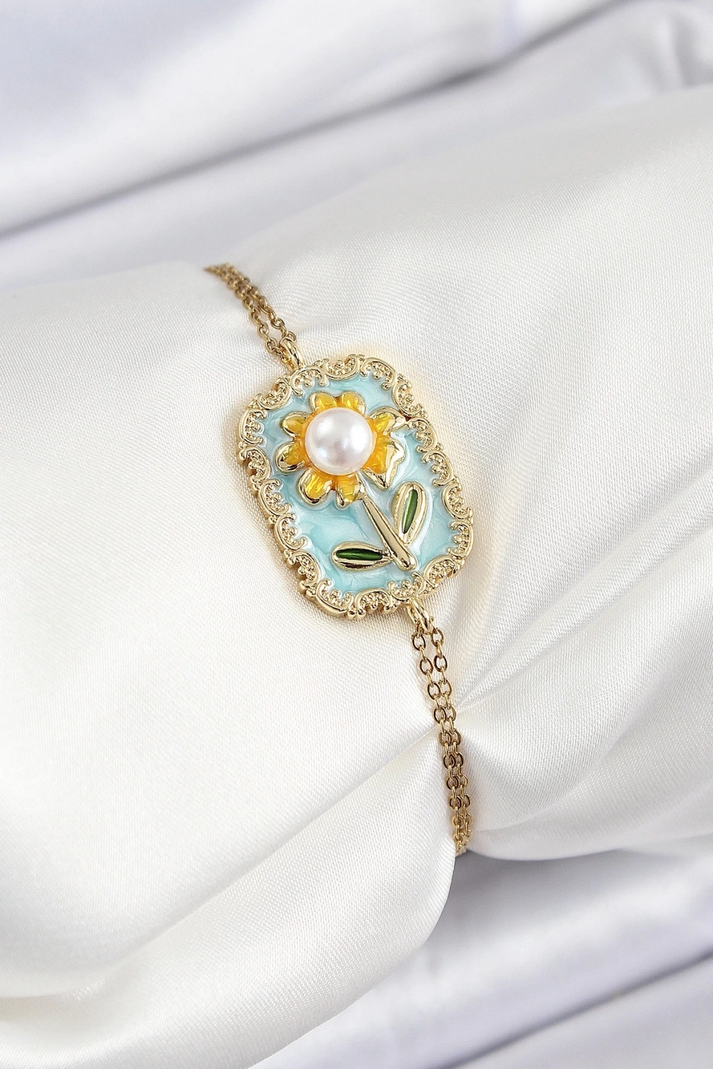 BFS 316L Çelik Zincir Turkuaz Mineli Sanatsal Portre İnci Detaylı Papatya Model Gold Renk Kadın Bileklik
