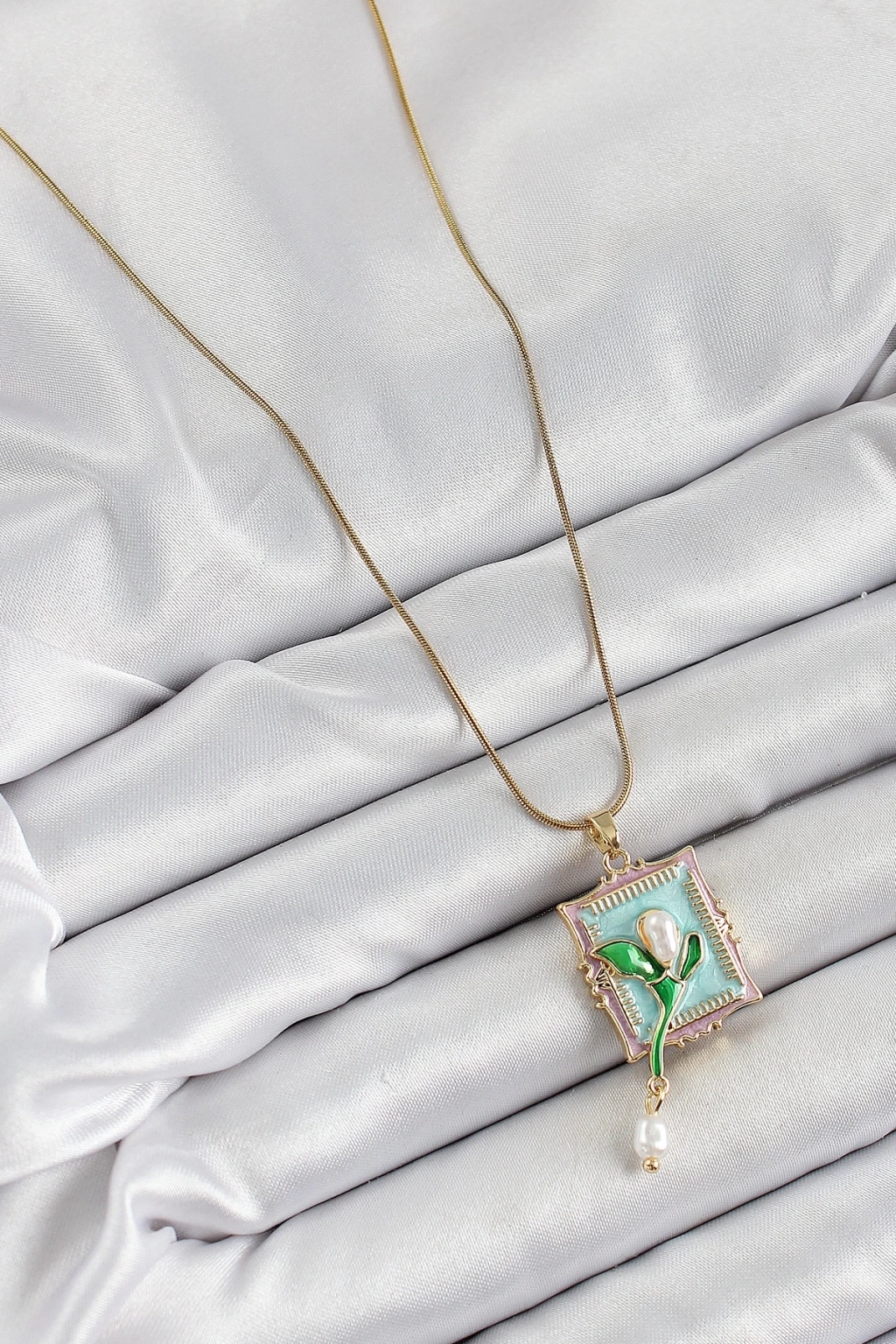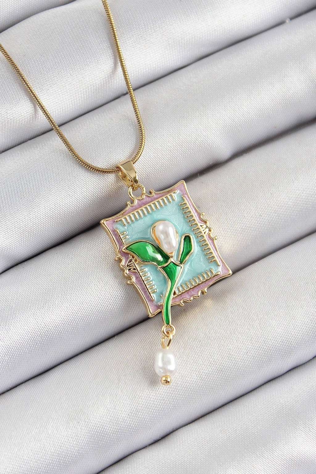 BFS 316L Çelik Zincir Turkuaz Sanatsal Portre Sallantılı İnci Detaylı Lale Model Gold Renk Kadın Kolye