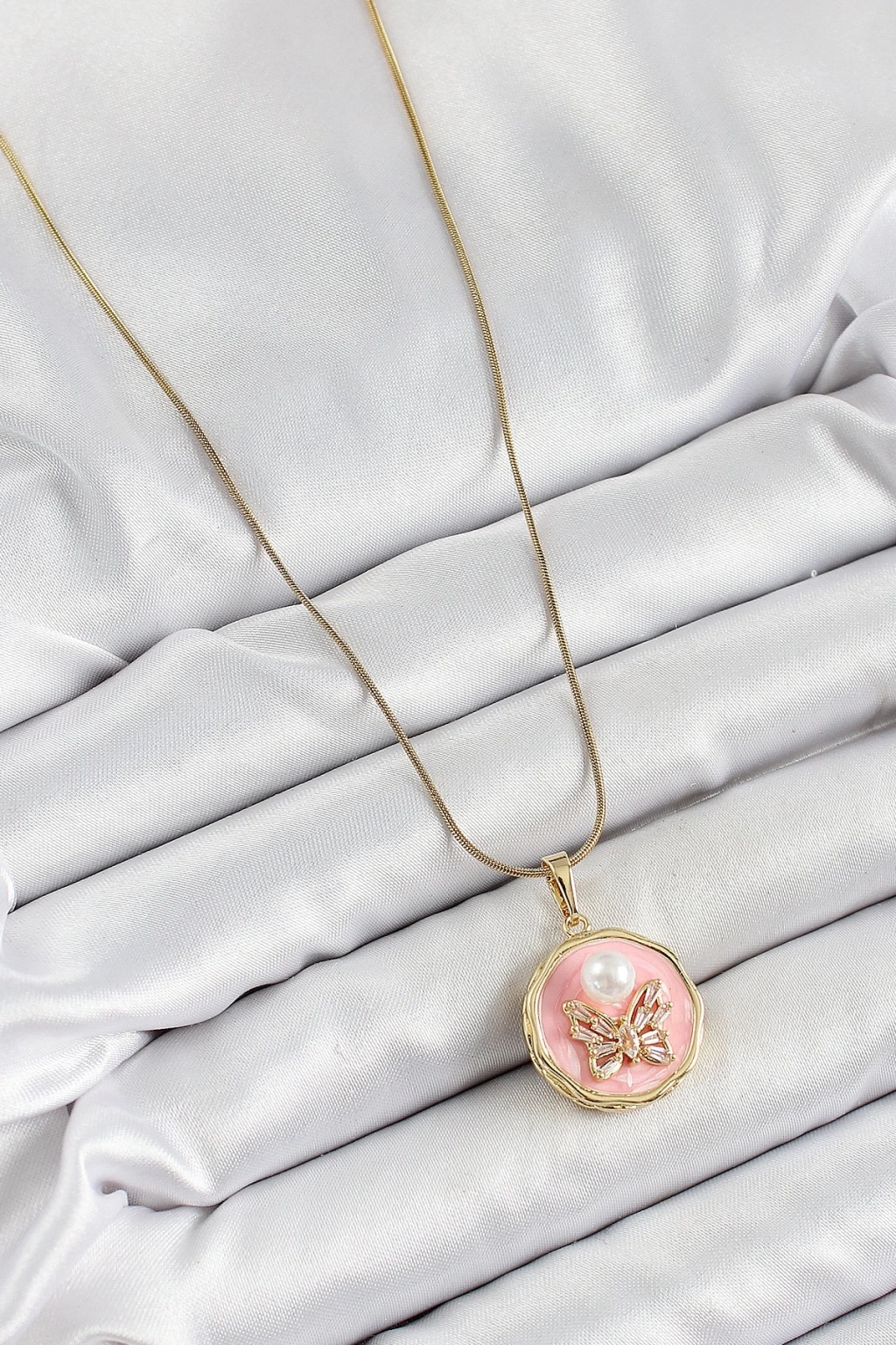 BFS 316L Çelik Zincir Zirkon Taşlı Pembe Sanatsal Portre İnci Detaylı Kelebek Model Gold Renk Kadın Kolye