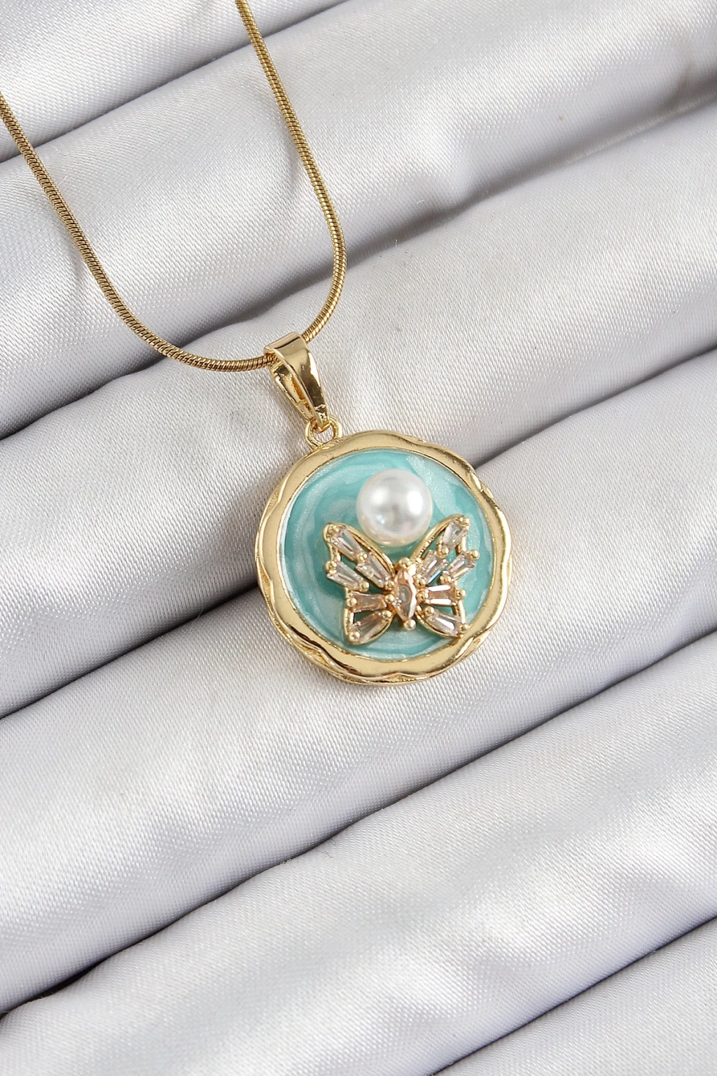 BFS 316L Çelik Zincir Zirkon Taşlı Turkuaz Sanatsal Portre İnci Detaylı Kelebek Model Gold Renk Kadın Kolye