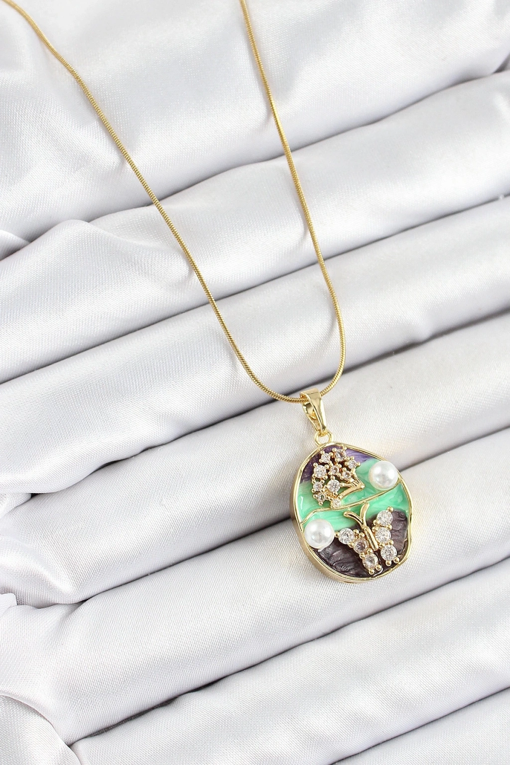 BFS 316L Çelik Zincir Zirkon Taşlı Yeşil Mor Sanatsal Portre İnci Detaylı Ağaç Ve Kelebek Figürlü Model Gold Renk Kadın Kolye