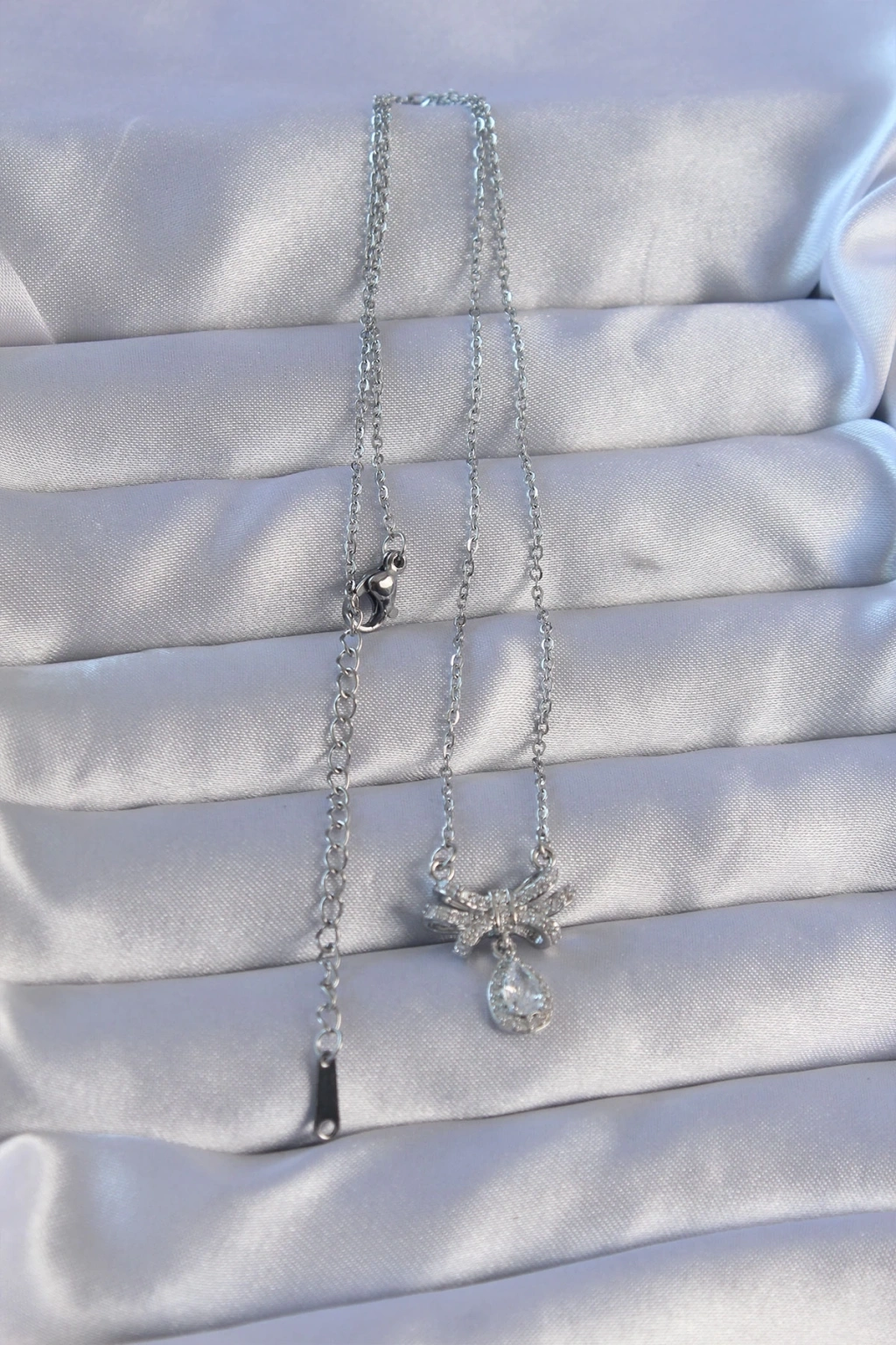 BFS 316L Çelik Zincirli Gümüş Renk Zirkon Taşlı Damla Detay Fiyonk Model Kolye