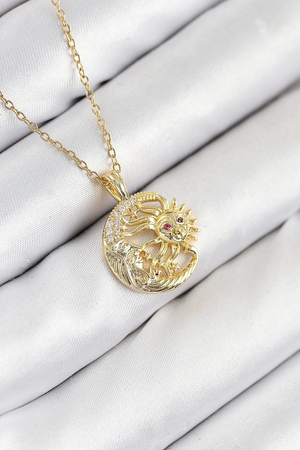 BFS 316L Çelik Zirkon Taşlı Ay Ve Güneş Model Gold Renk Kadın Kolye