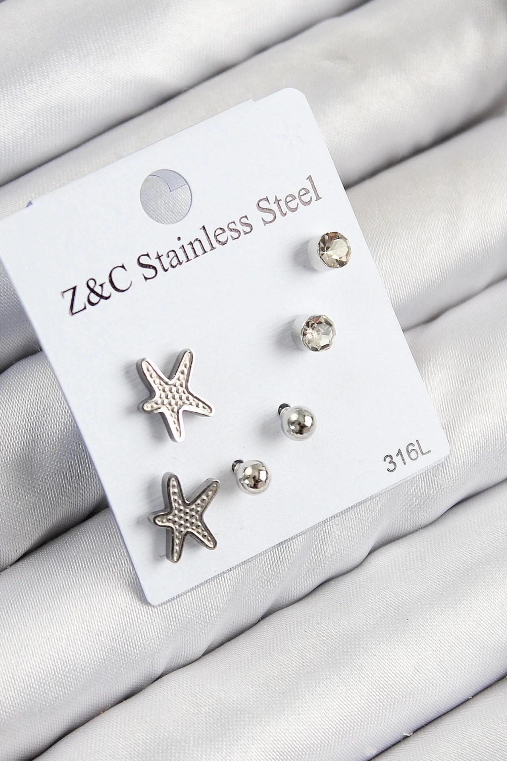 BFS 316L Çelik Zirkon Taşlı Deniz Yıldızı Model Gümüş Renk Kadın Set Küpe