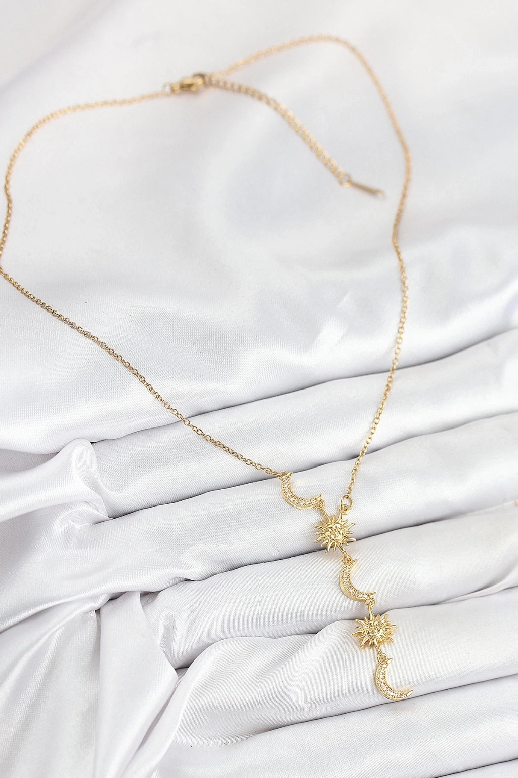 BFS 316L Çelik Zirkon Taşlı Güneş Ve Ay Model Gold Renk Kadın Kolye