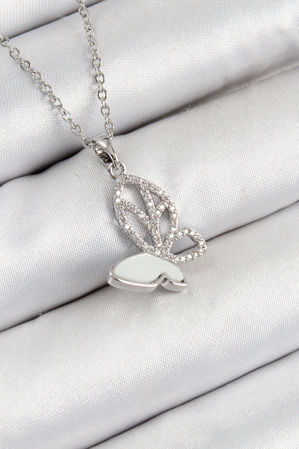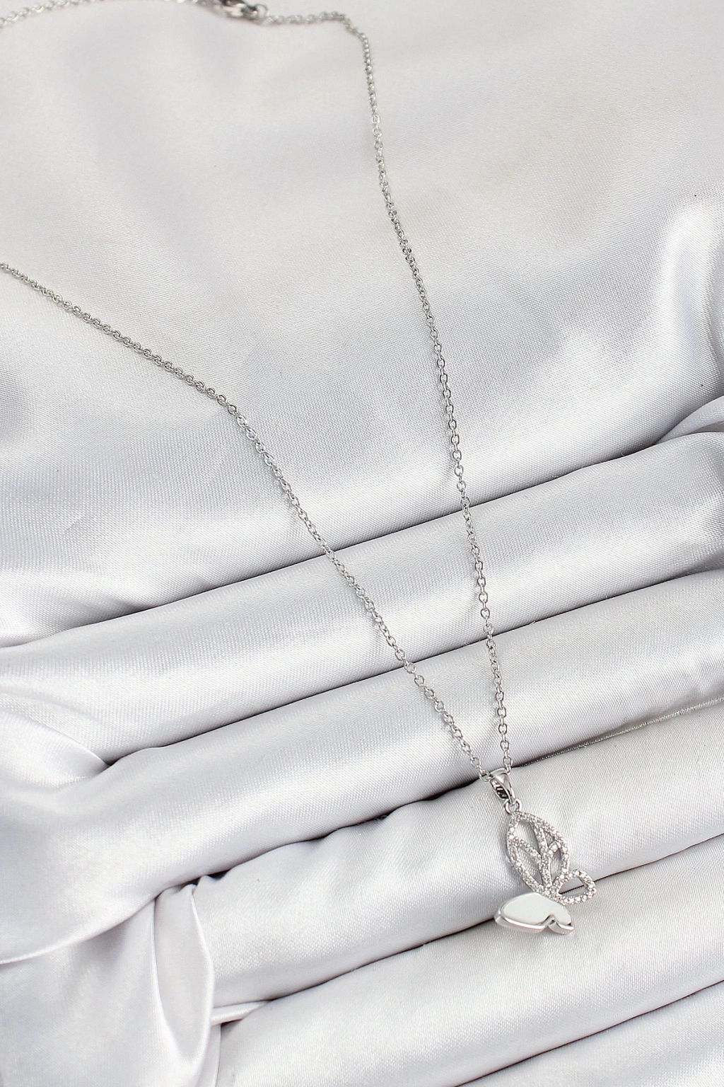 BFS 316L Çelik Zirkon Taşlı Kelebek Model Gümüş Renk Kadın Kolye