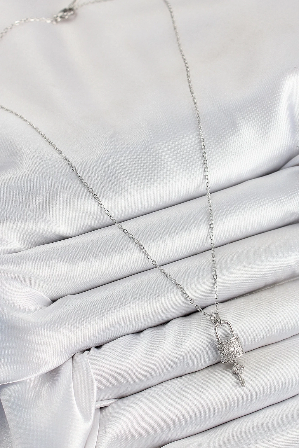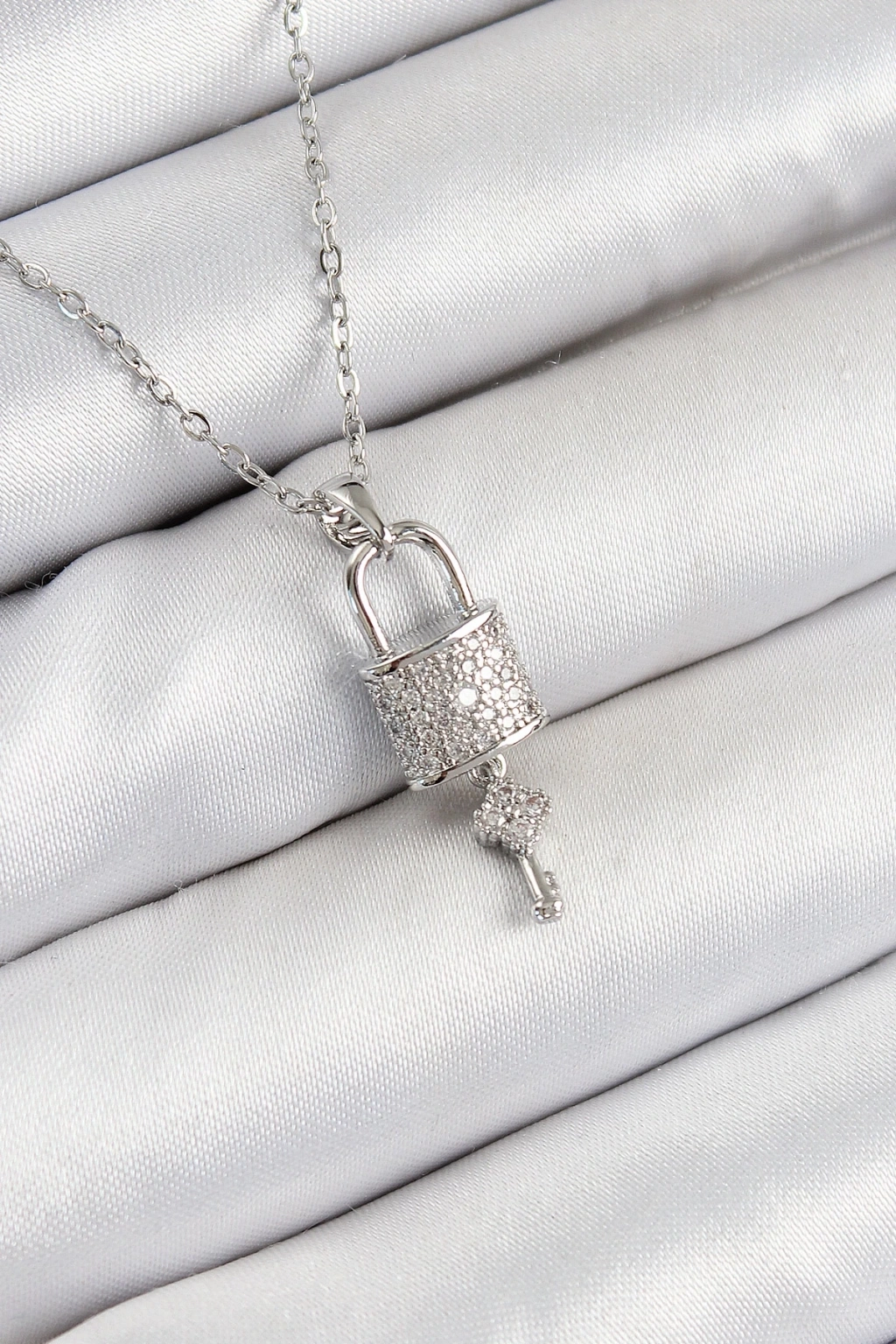 BFS 316L Çelik Zirkon Taşlı Kilit Ve Sallantılı Anahtar Model Gümüş Renk Kadın Kolye