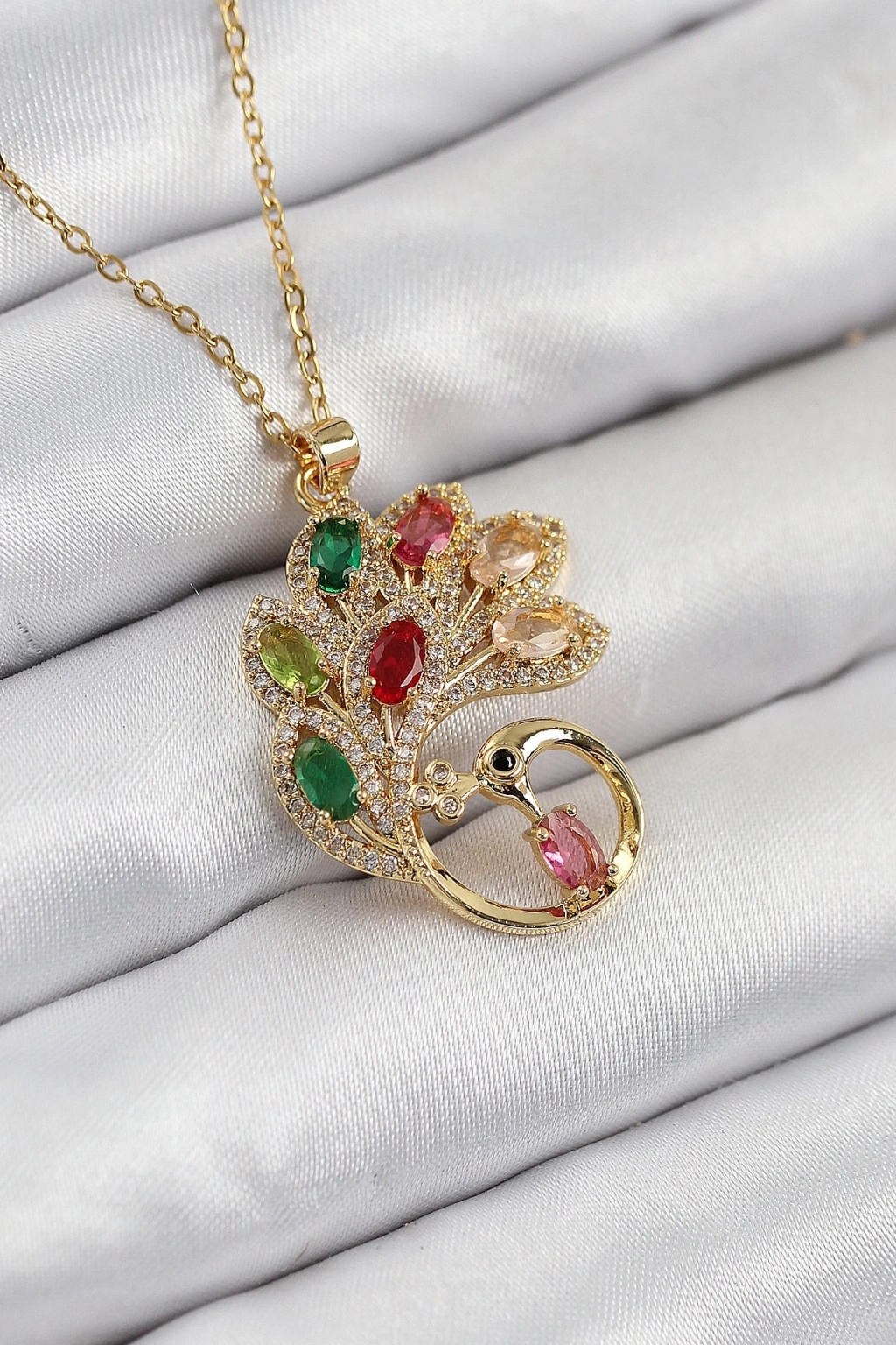 BFS 316L Çelik Zirkon Taşlı Tavus Kuşu Model Gold Renk Kadın Kolye