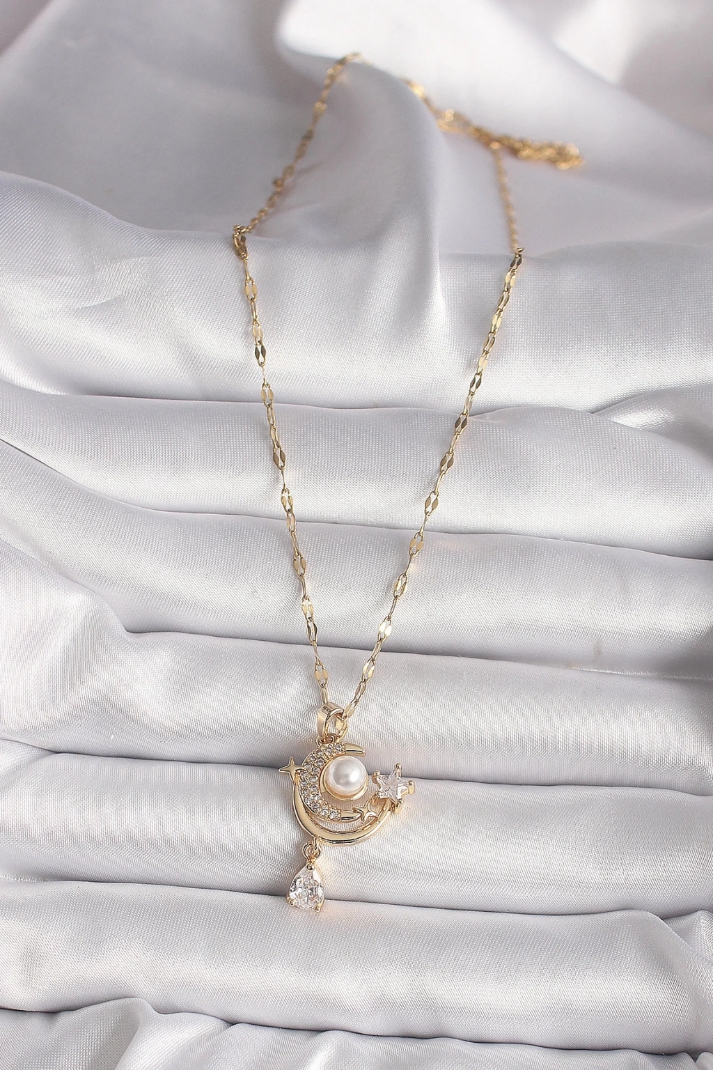 BFS 316L Gold Renk Zirkon Taşlı Ay Yıldız Model Sallantı Detay Kadın Kolye