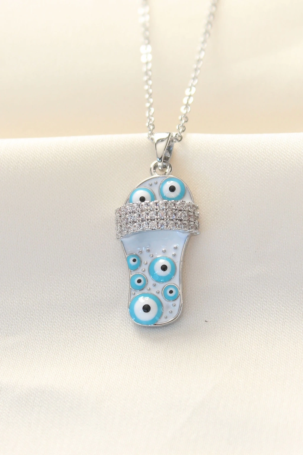 BFS 316L Zinciri Çelik Zirkon Taşlı Gümüş Renk Nazar Boncuklu Terlik Kolye