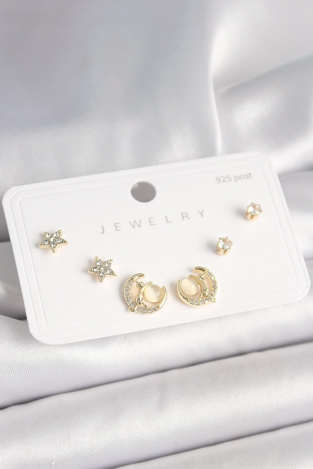 BFS 925 Ayar Gümüş Çivi Zirkon Taşlı Hilal Yıldız Model Kadın Küpe Seti