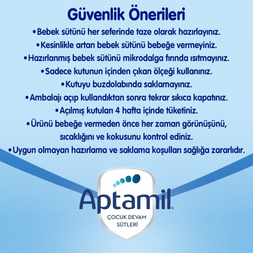 Anne sütü, bebekler için en iyi ve en doğal besindir. Zamanında doğan tüm sağlıklı bebeklerin besin ihtiyacını ilk 6 ay tek başına karşılar. 2 yaşına kadar bebeğinizin bağışıklığını güçlendiren en üstün besin anne sütüdür. Avrupa Patentli Aptamil Pronutra ADVANCE, bebeğinizin özel beslenme ihtiyaçlarını karşılamak amacıyla geliştirilmiştir. Aptamil 1 Bebek Sütü'nün 250 g, 350 g, 800 g, 900 g, 1000 g ve 1200 g olmak üzere 6 ürün boyu bulunmaktadır. Aptamil 1 Bebek Sütü’nün içeriğinde, balık yağı kullanıldığından, hazırlama ve kullanım sırasında balık yağı kokusu duyabilirsiniz.Aptamil 1 Bebek Sütü ilave şeker içermez. Etiket üzerinde yer alan şekerler bilgisi mevzuat gereği zorunlu gösterim şeklidir. Doğal olarak sütte bulunan süt şekeri yani laktozu ifade etmektedir. (Karbonhidrat kaynağı %100 laktozdur.)Doktorunuz farklı bir öneride bulunmadığı takdirde 6. ayın sonunda Aptamil 2 Devam Sütü’ne geçebilirsiniz. *Anne sütü bebeğiniz için en iyisidir. Anne sütü ile beslenmenin mümkün olmadığı durumlarda doktorunuza danışınız.Ürün görselinde birden fazla renk ve çeşit olduğunda stokta bulunan ve gönderilecek olan ürün için soru sor kısmından bizimle iletişime geçebilirsiniz