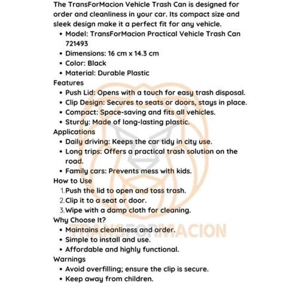 Araç içinde çöp birikimini önlemek için ideal bir çözüm.