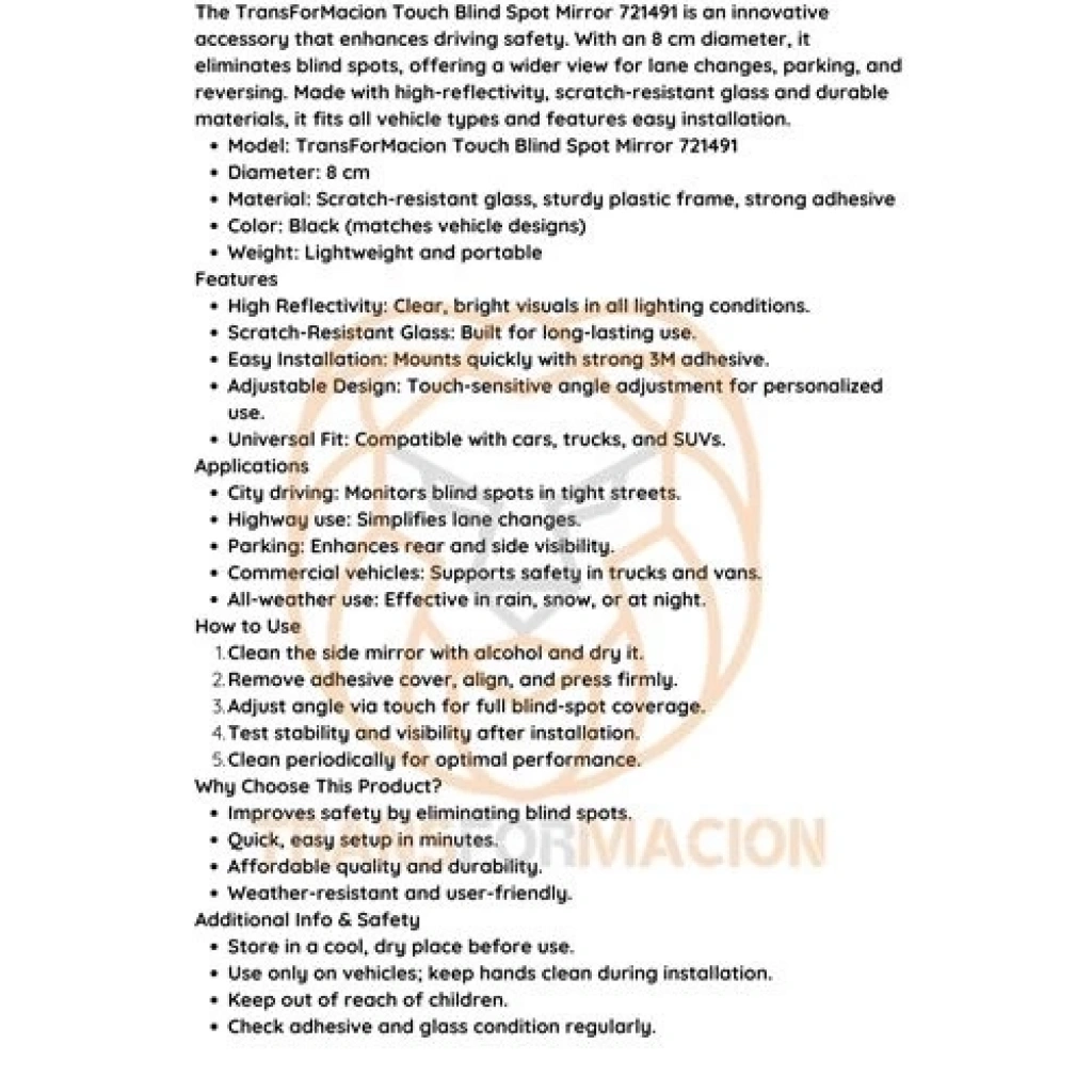 Ürün Özellikleri Bu kör nokta aynası, sürücülerin güvenliğini ön planda tutarak tasarlanmıştır. Geniş görüş açısı ve dokunmatik ayar özelliği ile kullanım kolaylığı sağlar.