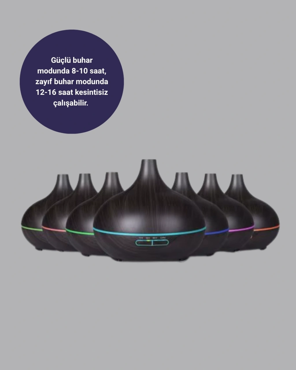 Rahatlatıcı bir atmosfer ve sağlıklı hava dengesini bir araya getiren Aromaterapi Difüzörü 550 ml Ultrasonik Nemlendirici Otomatik Kapanma Özellikli, yaşam alanlarınıza ferahlık katar.550 ml su kapasitesi, uzun süreli kullanım olanağı tanır — güçlü buhar modunda 8-10 saat, düşük modda ise 12-16 saat aralıksız çalışabilir.Ultrasonik buhar teknolojisi, suyu sessiz ve etkili şekilde dağıtarak ortamdaki nem seviyesini dengeler.Birkaç damla esans ekleyerek aromaterapi etkisini artırabilir, zihninizi dinlendirebilirsiniz.Otomatik kapanma güvenlik sistemi, su azaldığında cihazı devre dışı bırakır.Ayrıca 1, 3, 6 saatlik zamanlayıcı seçenekleri ile kullanım süresini tamamen size bırakır.7 renkli LED ışık seçeneği, odanıza dekoratif bir görünüm kazandırırken loş veya parlak modlarıyla ambiyansınızı kişiselleştirmenizi sağlar.Sessiz çalışma özelliği (21 dB altı) ile uyku, meditasyon ve ofis ortamları için idealdir.Modern, sade ve fonksiyonel tasarımıyla bu difüzör; hem görsel hem de işlevsel açıdan evinizin en keyifli parçası olacak.